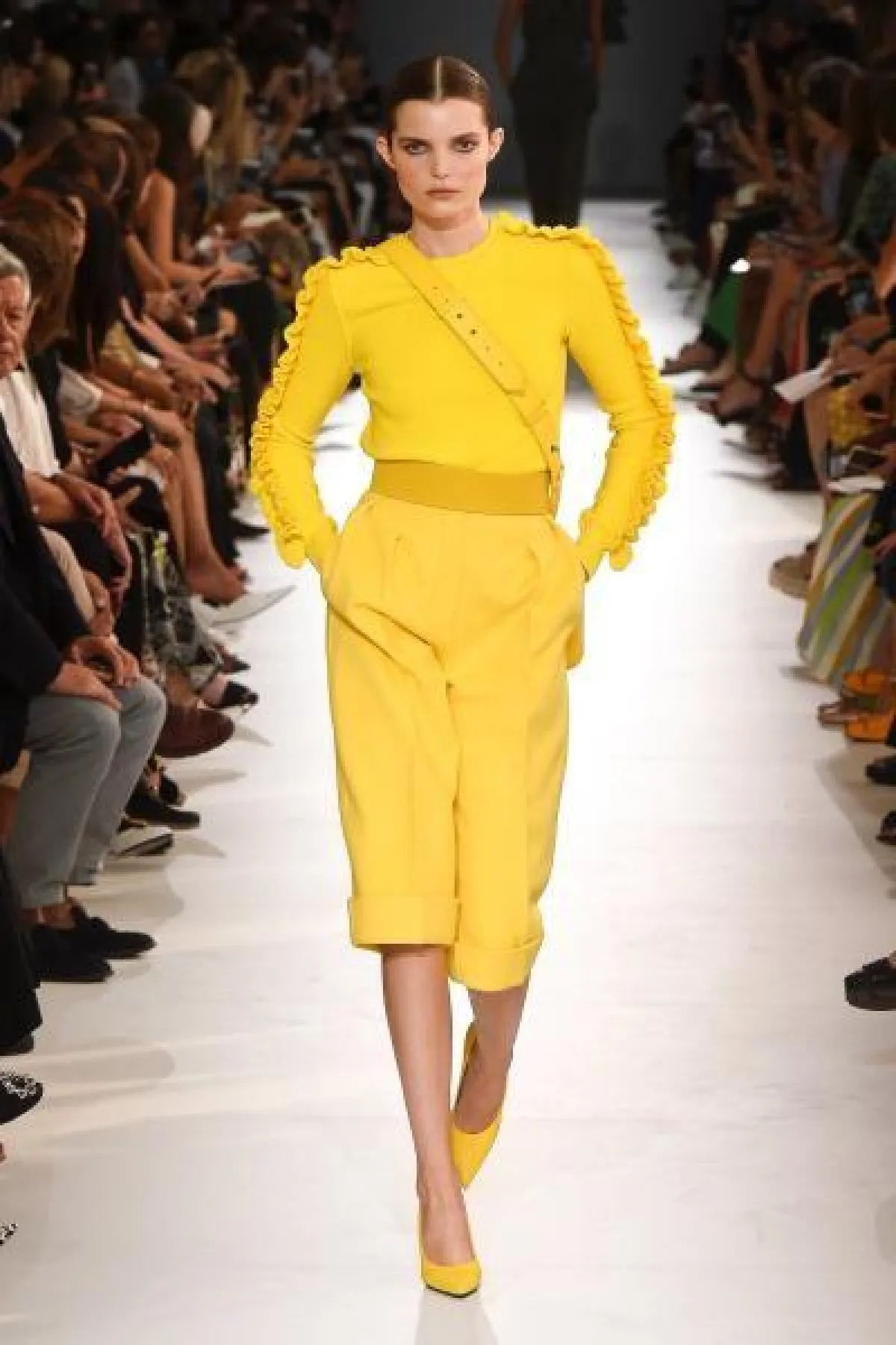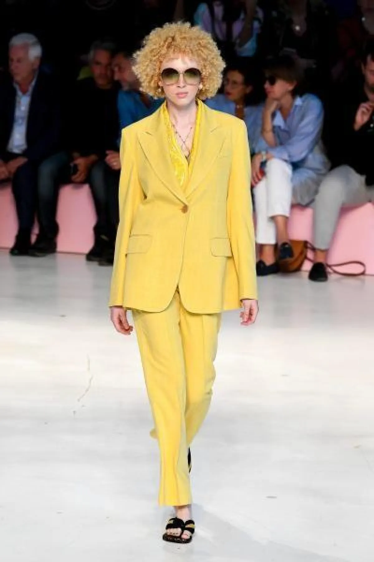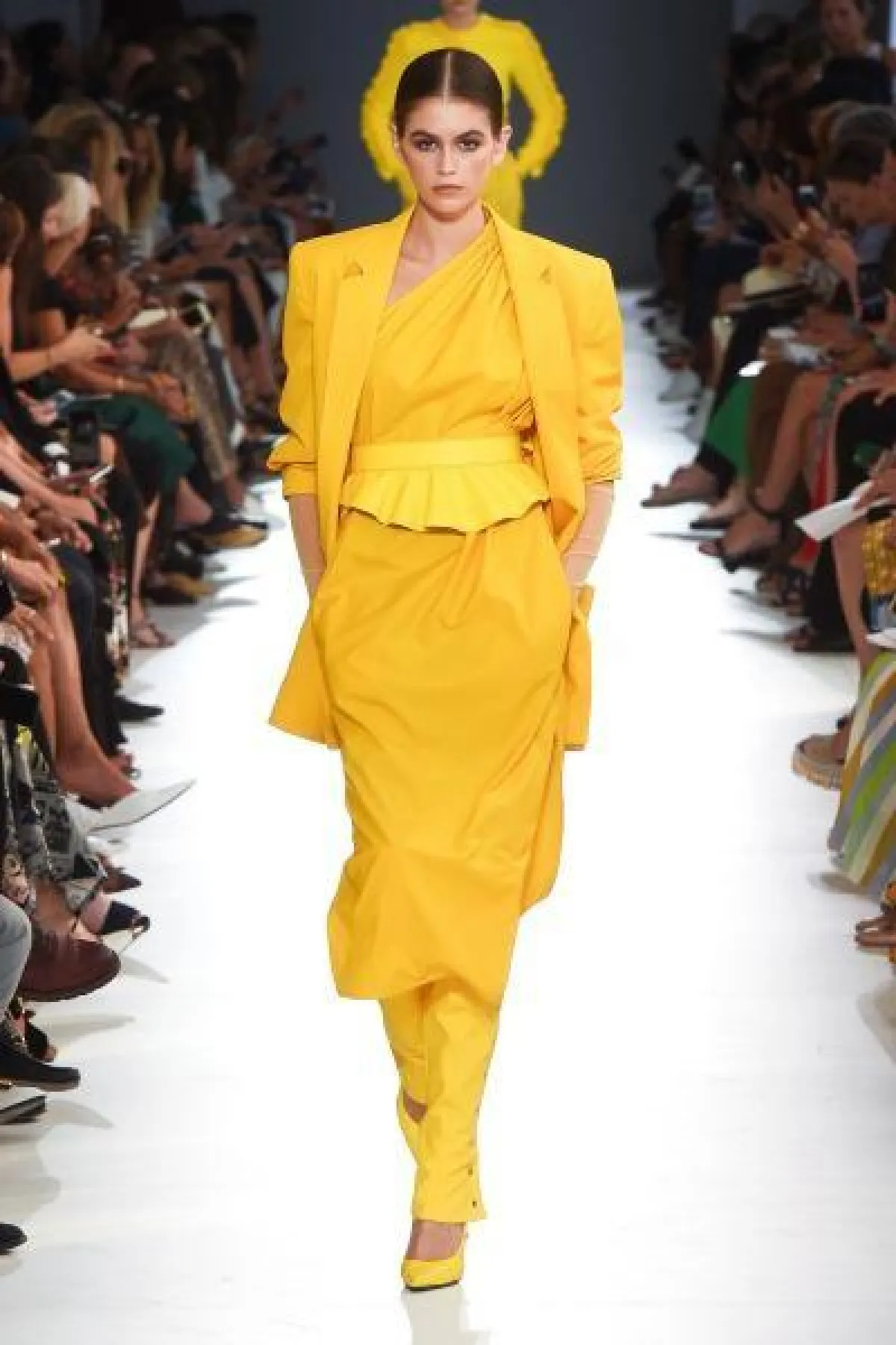 - خصصت ماركة ماكس مارا Max Mara جانب كبير من عرضها للأزياء الصفراء، فلفتنا الفستان الذي تألقت به كايا جربر والمزين بكشاكش أشبه بستايل الـ Peplum والتي يُنصح بها لإخفاء بروز البطن، وأكملت الطلة ببليزر طويل بأكتاف عريضة يمكن تنسيقه بمفرده مع إطلالة كاجوال.