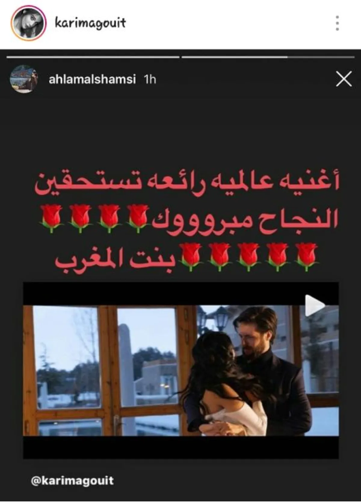 ونشرت أحلام عبر ستوري حسابها الرسمي على تطبيق الصور والفيديوهات "انستقرام"، مقتطفًا من فيديو أغنية كريمة غيث "بنت الفشوش" (بنت الجاه)، أرفقتها بتعليق جاء فيه: "أغنية عالمية رائعة تستحقين النجاح مبروك لبنت المغرب".
