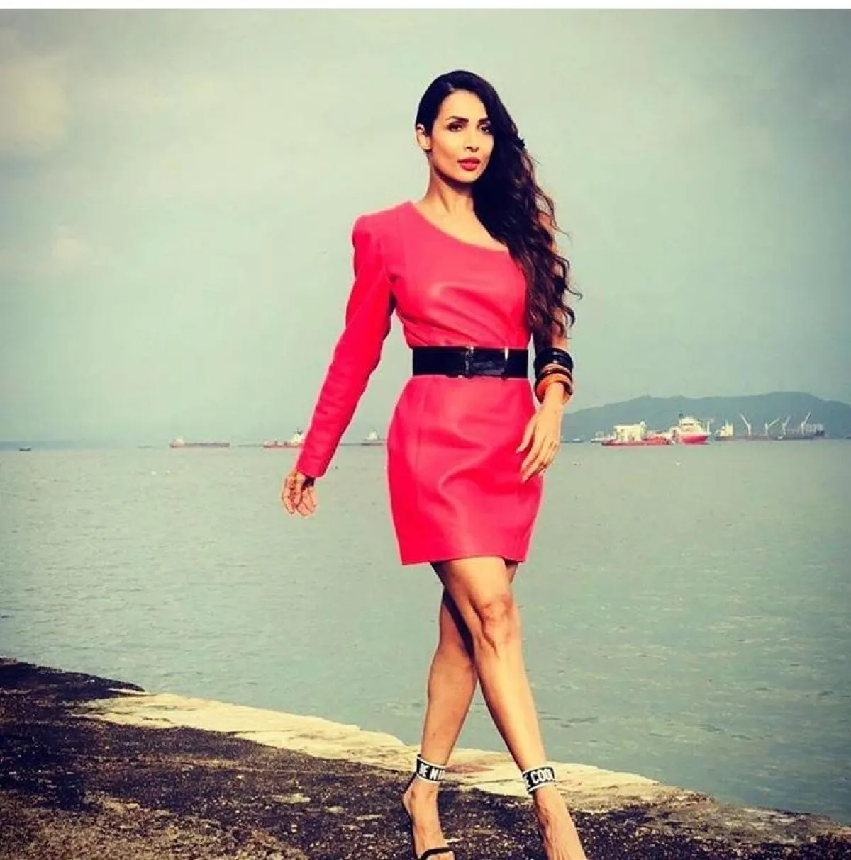 ولكن، إذا كنت تميلين للحصول على إطلالة بسيطة وهادئة، و مثيرة في الوقت نفسه، فسيعجبك التصميم من النجمة Malaika Arora ماليكا أرورا بـ الفستان الجلد بصيحة الكتف الواحدة، مع كعب عال جدًا باللون الأسود، ورباط الكاحل ليبرز طولك.