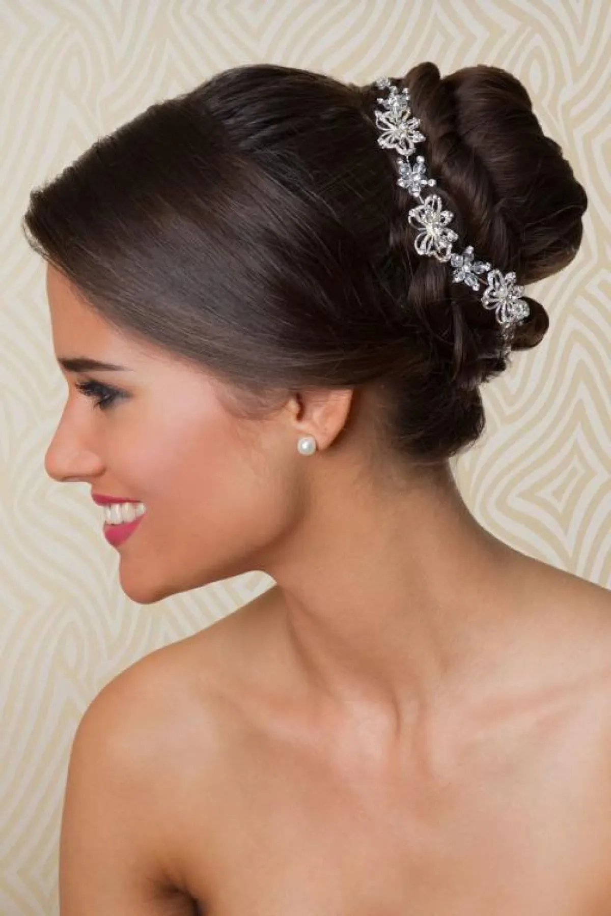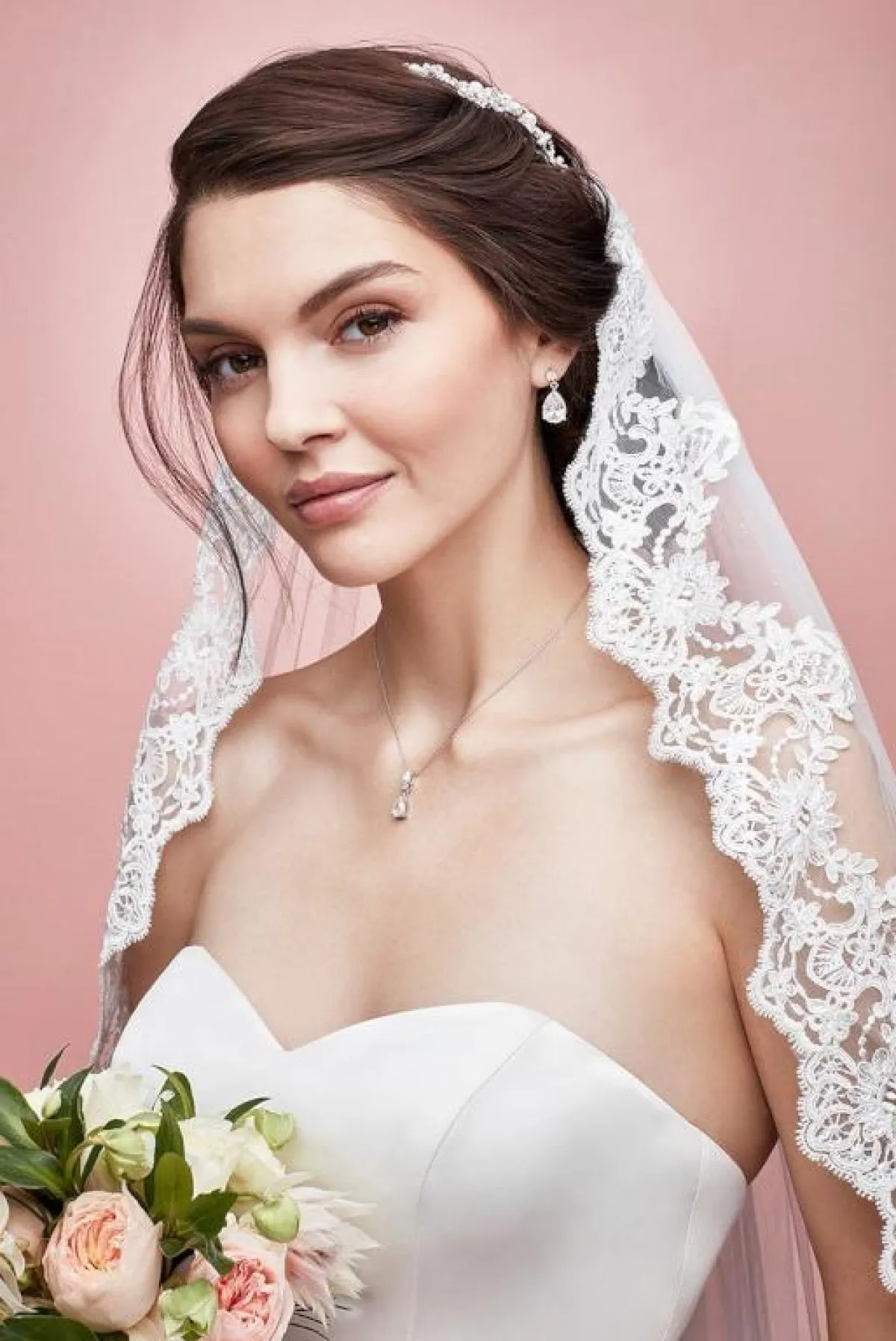 إذا كنت تحبين تصفيفة رفع الشعر الأعلى، اختاريها، مع غرة الشعر على جنب، لكي تضيف لمسة ناعمة لوجهك، مع تاج بسيط، وطرحة مطرزة بـ الدانتيل منسدلة من أسفل الكعكة.