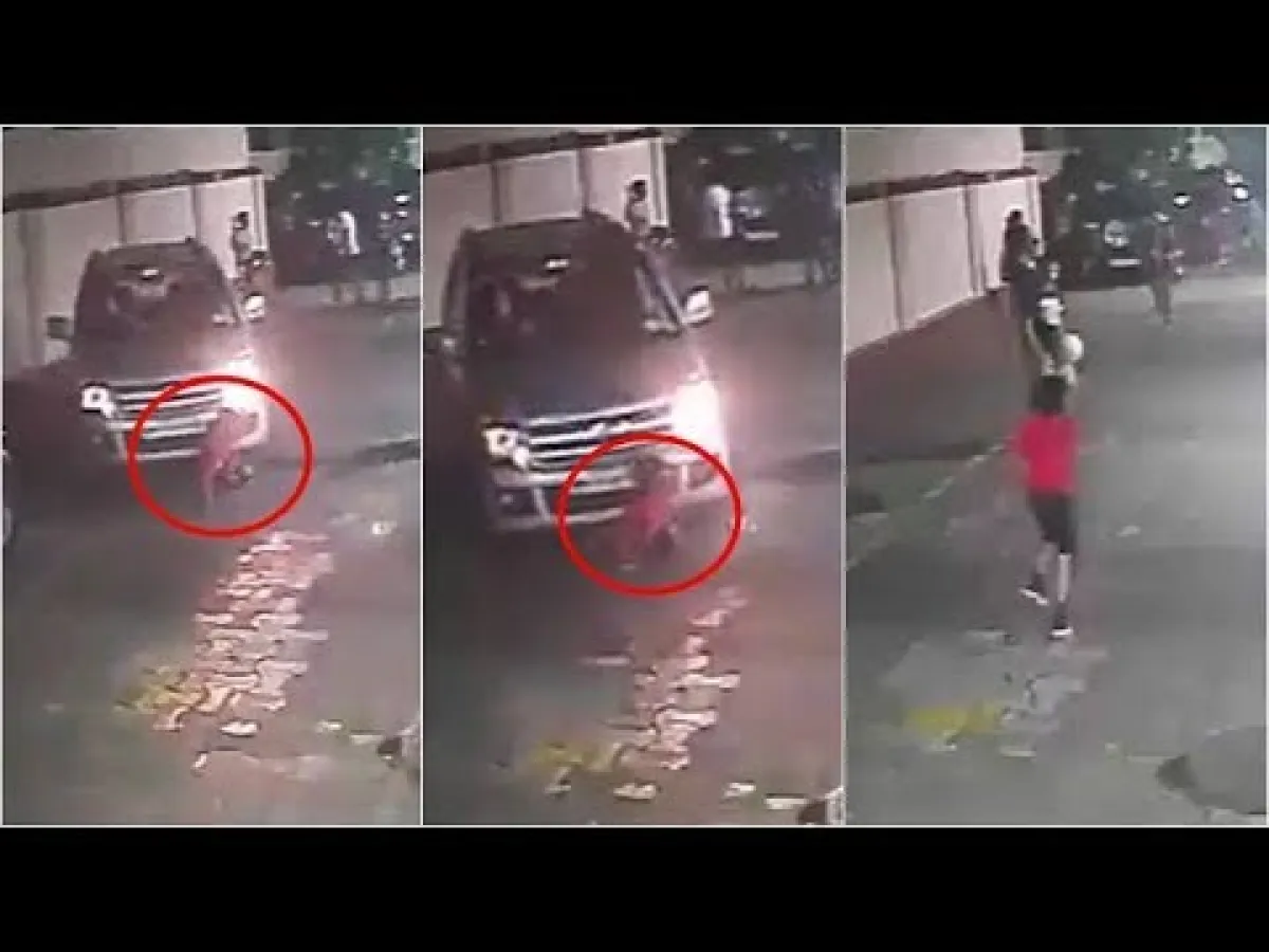 وقد عبرت السيارة من فوقه دون أن تدهسه العجلات، ثم قام الطفل من جديد وكأن شيئاً لم يكن، وجرى على الفور تجاه الأطفال ليلعب معهم ولم يصب بأذى.