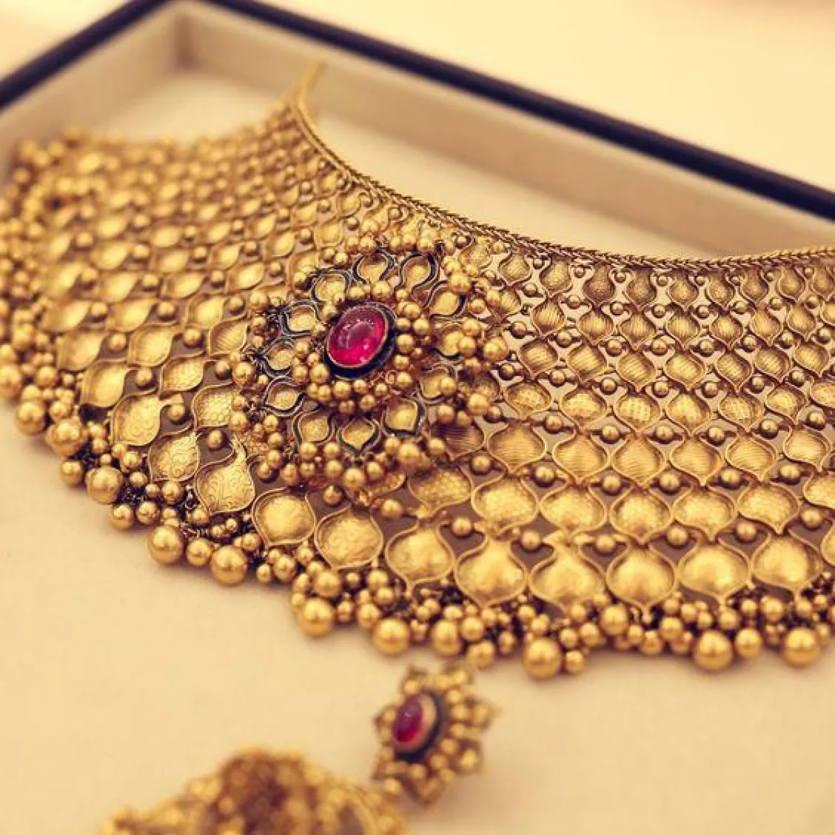 أعجبنا أيضا العقود المتدلية، كالعقد الفخم المتدلي منه وردة كبيرة من الذهب، مرصعة بـ الأحجار الكريمة باللون الأحمر، وعادة ما ستختارين معها أقراط أذن مرصعة بنفس لون الحجر أيضا.