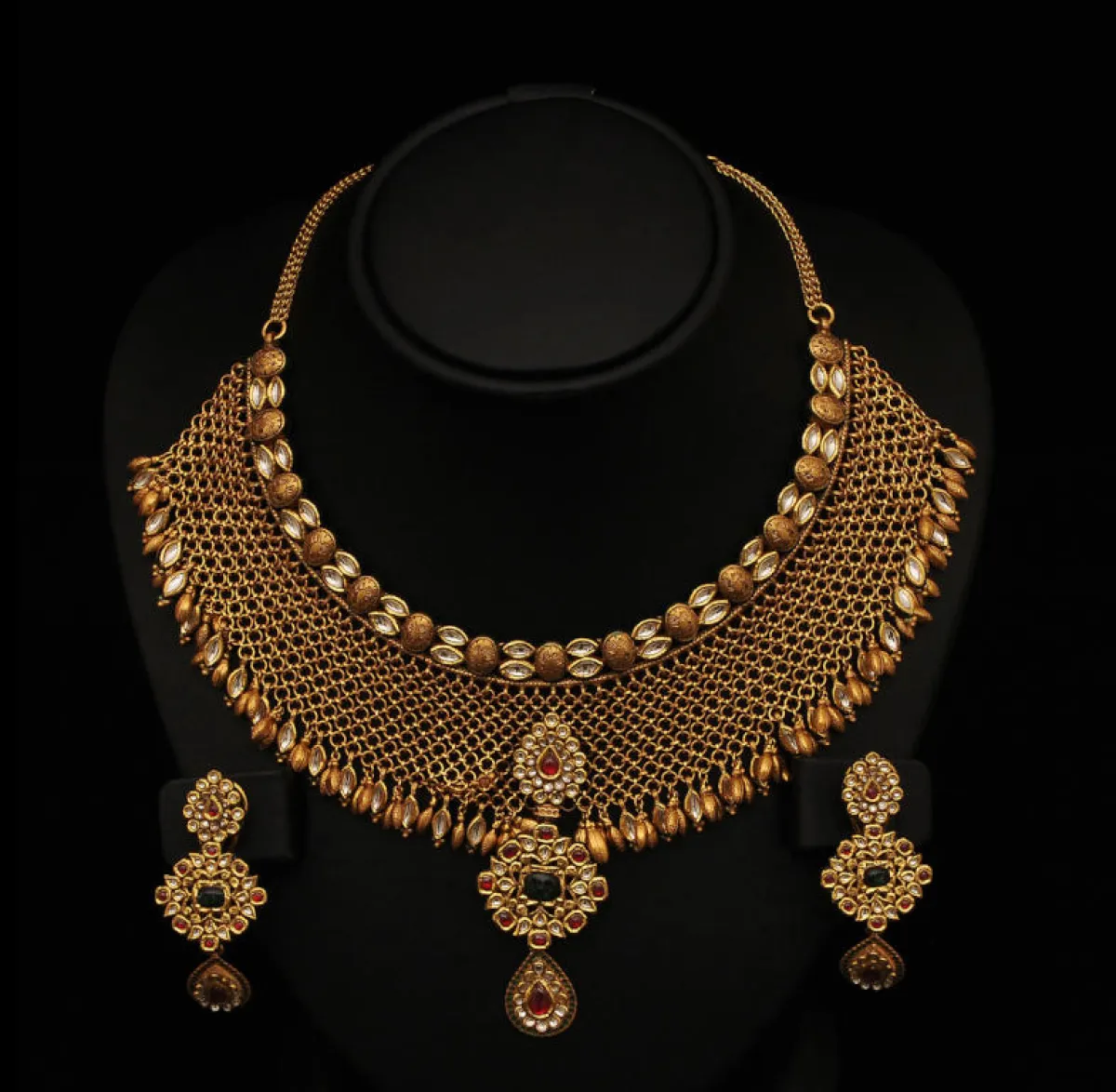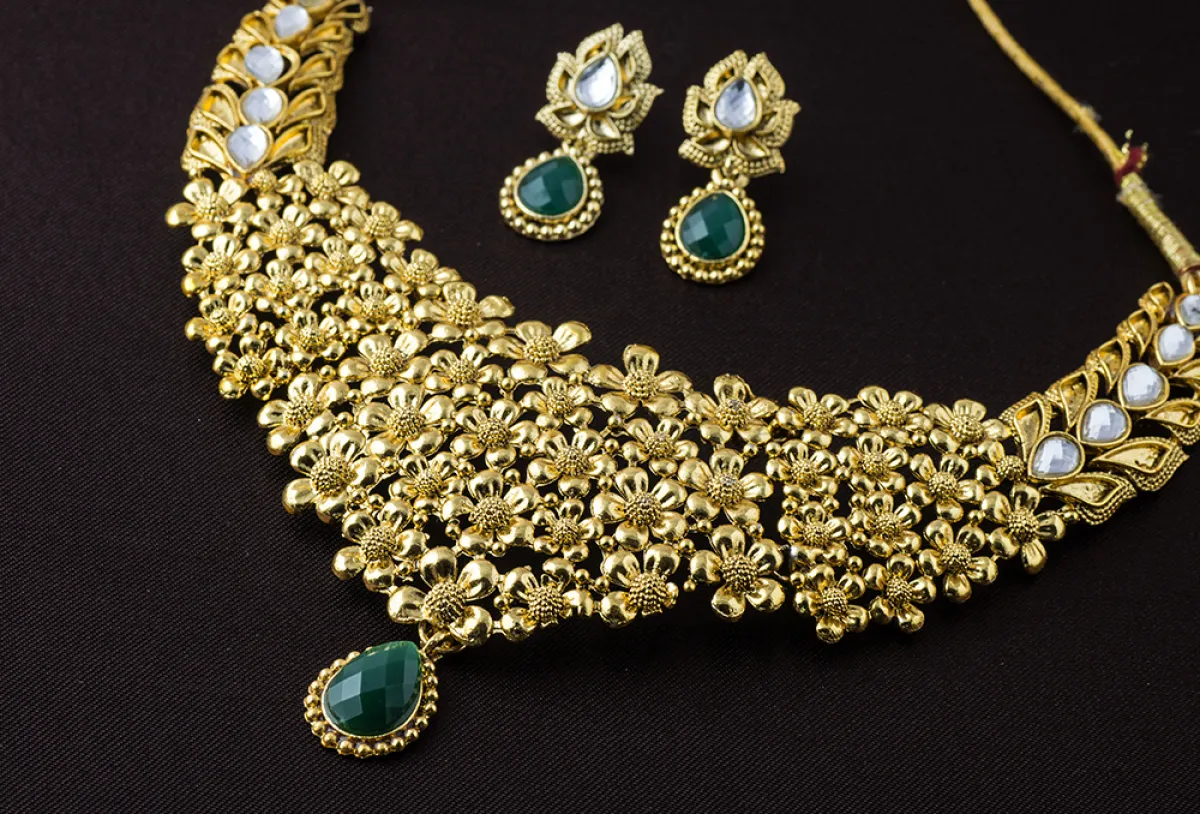كما يمكنك الاعتماد على العقد الذهبي المرصع بـ الأحجار الكريمة باللون الأخضر، والتي تعتبر من أفضل الألوان التي تناسب اللون الذهبي البراق للعقود الهندية.