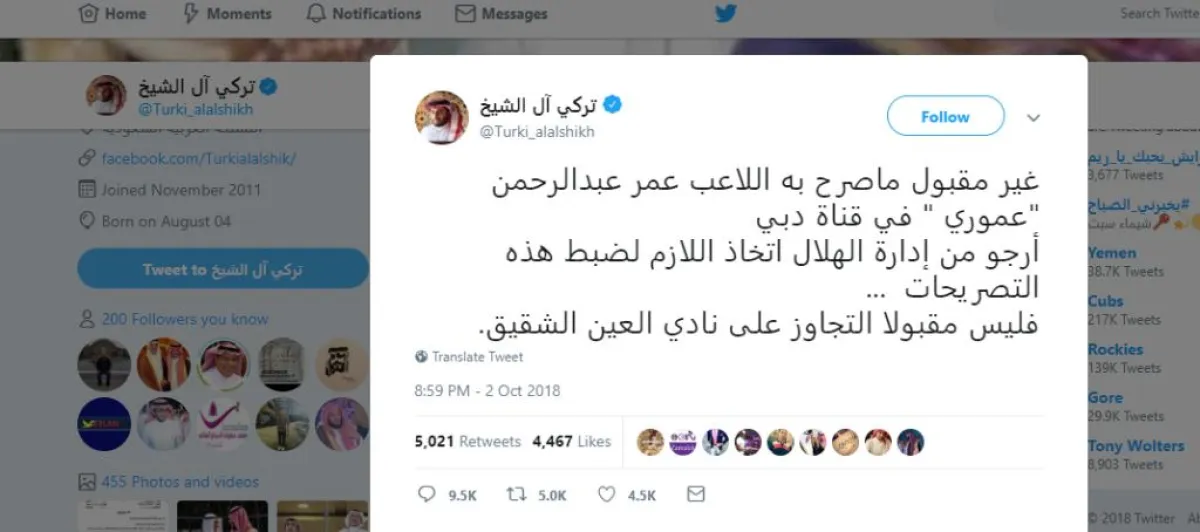 عموري تطرق في اللقاء إلى كثير من الأمور التي أغضبت بعضهم، منها أن إدارة نادي العين لم تسلمه مستحقاته حتى الآن، ما أغضب تركي آل الشيخ، رئيس مجلس إدارة الهيئة العامة للرياضة، الذي غرد قائلاً: "غير مقبول ما صرح به اللاعب عمر عبدالرحمن في قناة دبي. أرجو من إدارة الهلال اتخاذ اللازم لضبط هذه التصريحات. ليس مقبولاً التجاوز على نادي العين الشقيق".