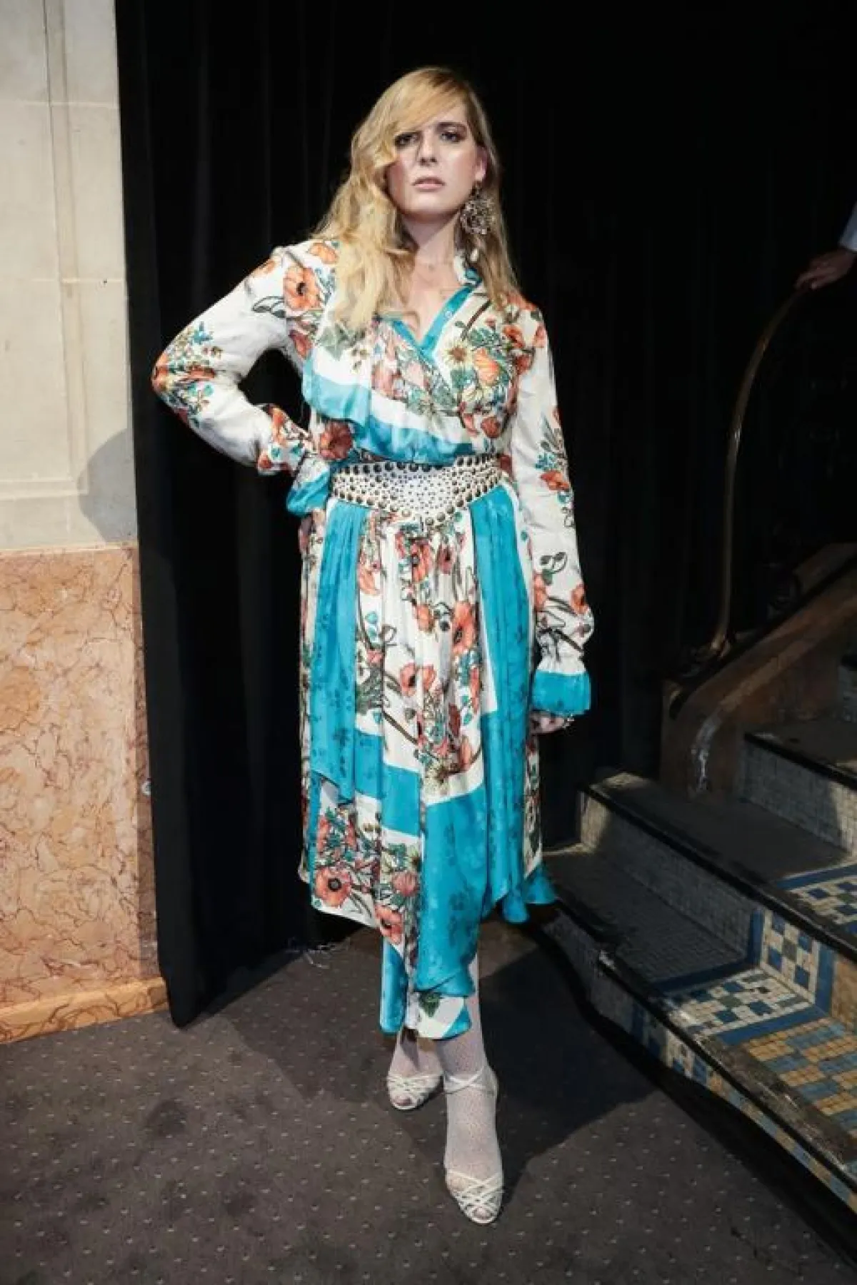 كما وظهرت Hari Nef خلال تواجدها بالصفوف الأمامية لعرض Gucci معتمدة الطلة الموديست. فارتدت فستاناً من الحرير المطبع بالورود ، بالإضافة إلى جرابات وصندل أبيض.