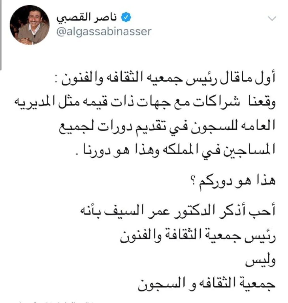 واستنكر القصبي تصريح السيف متسائلاً: "هل هذا هو دوركم"؟ منوهاً إلى أن الدكتور عمر السيف، هو رئيس جمعية الثقافة والفنون، وليس جمعية الثقافة والسجون!