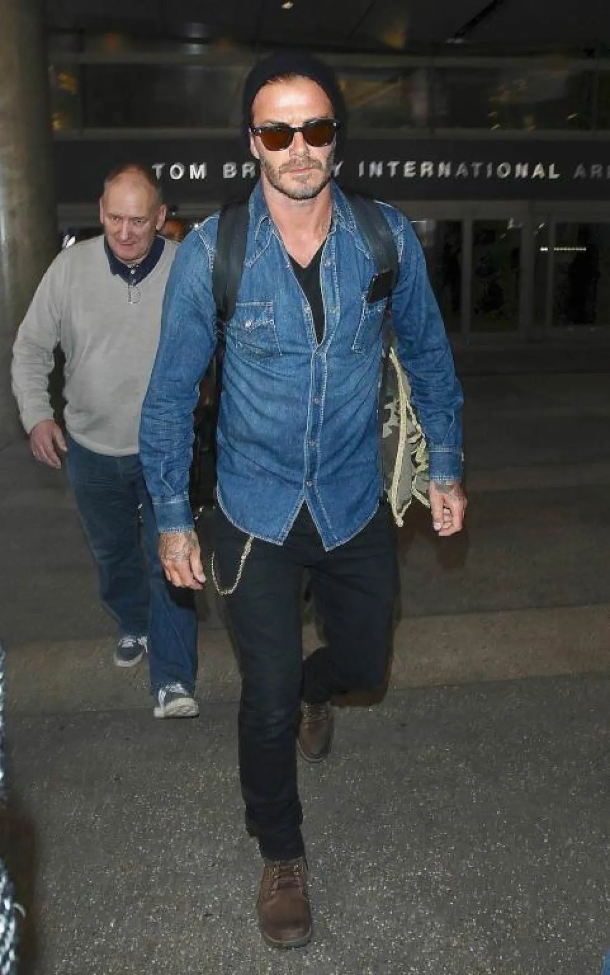 القميص الجينز هو الأنسب أثناء السفر، مثلما اختاره David Becham ديفيد بيكهام، مع البنطلون الجينز الأسود وحذاء السفاري الضخم، وحقيبة الظهر، لإطلالة مريحة، لا تتخلى فيها عن أناقتك.