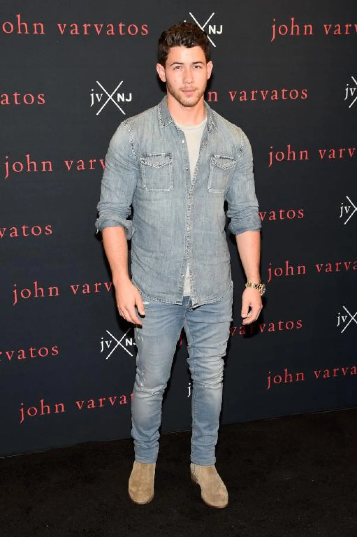 بينما اختار Nick Jonas نيك جوناس القميص و البنطلون باللون نفسه، مع حذاء Safty ضخم باللون البيج الفاتح، وارتدى قميصًا قطنيًا باللون الفاتح، إلا أن هذا اللوك لا يناسب الرجل قصير القامة، فتدرجات اللون تمنح الرجل مظهرًا أكثر طولًا.