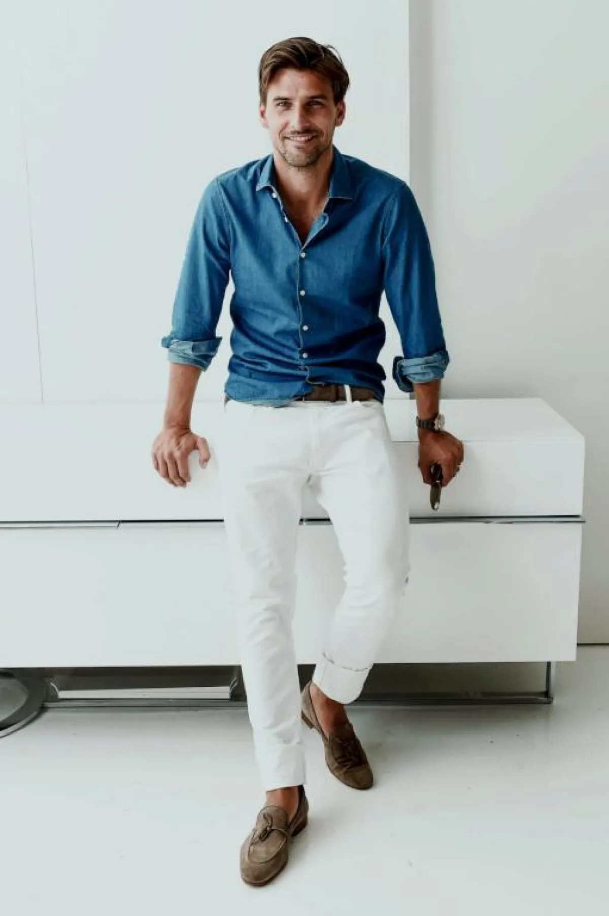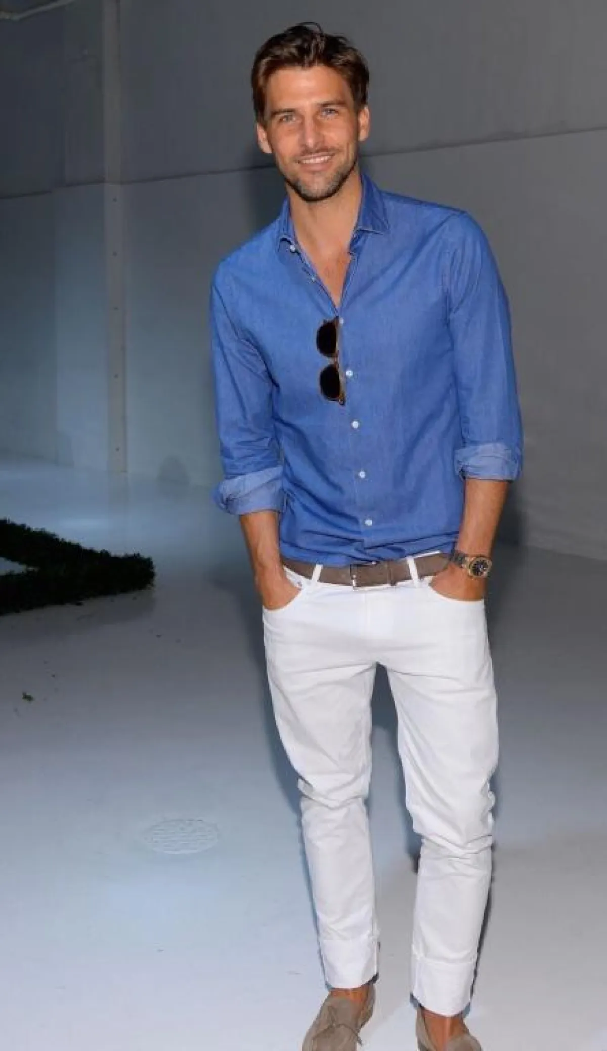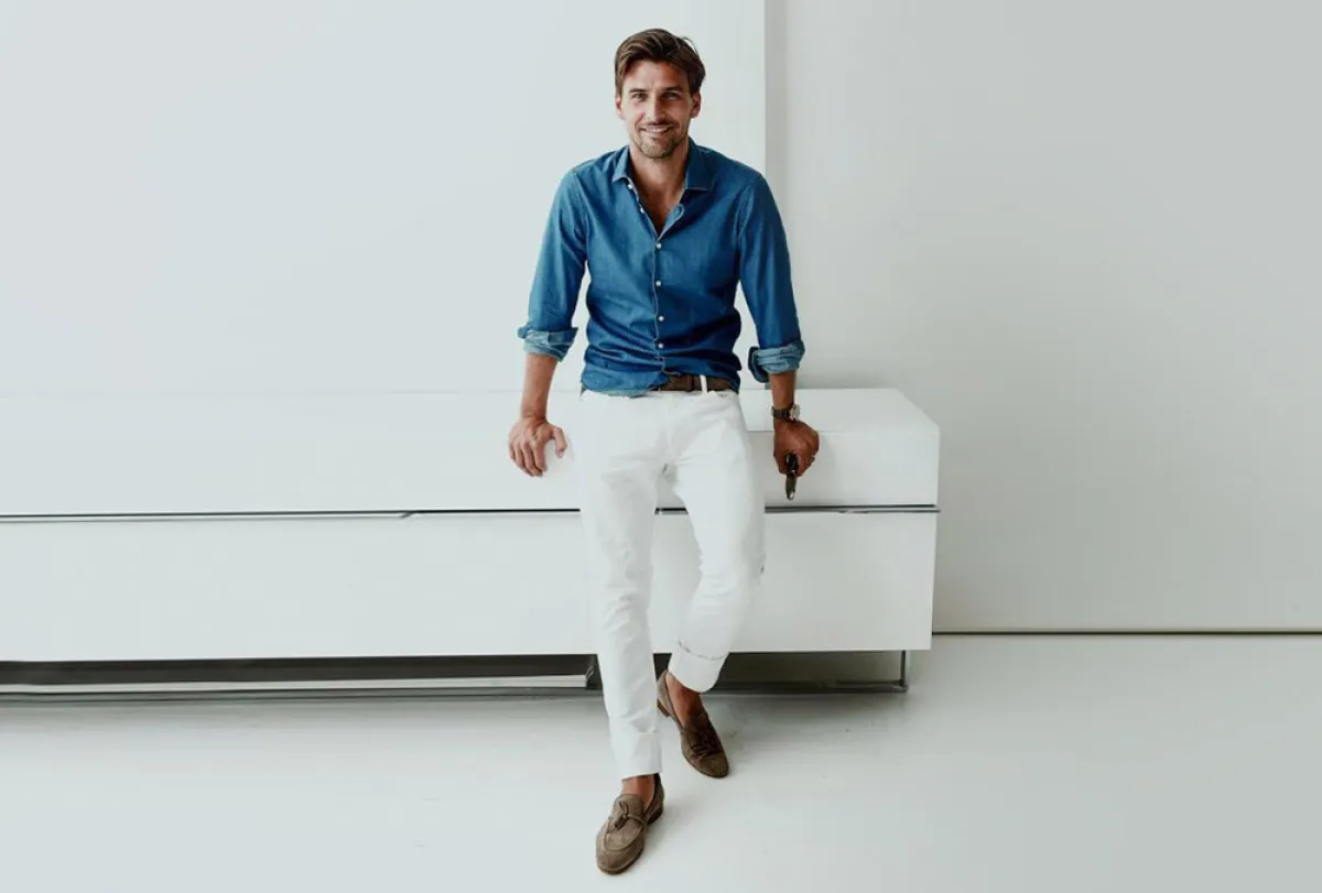 لطالما كان البنطلون الأبيض صديق القميص الجينز، مثلما نسقه العارض العالمي Johannes Huebl جوهانس هيوبيل، مع حذاء فيلفت باللون البيج الترابي، وحزام بنفس اللون، يناسب أوقات ما بعد الظهر.