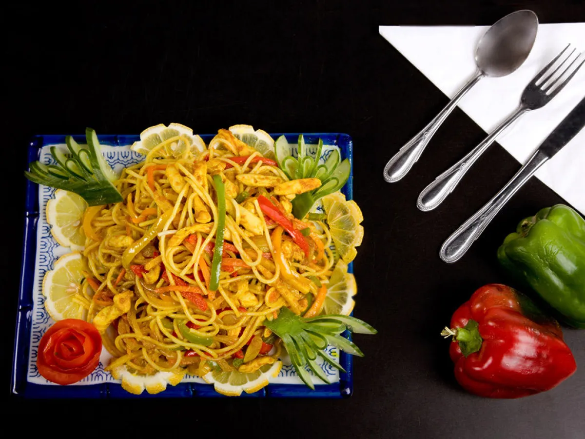 3-بعدها، تضاف بودرة الكاري والفلفل الملوّن المقطع إلى شرائح طولية، فالدجاج. ويقلّب هذا الخليط على النار.