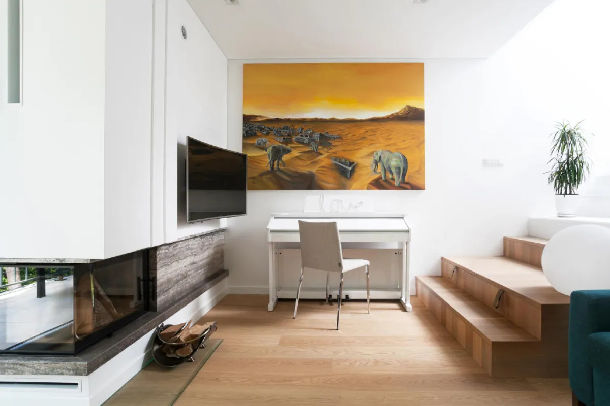 • تُعلَّق اللوحة فوق الأريكة أو رأسيَّة السرير، بحيث يكون الجزء السفلي من الإطار على علوِّ 25 سنتيمترًا، إذ يجب أن يكون العمل الفنِّي مرتبطًا بصريًّا بالأثاث، لا أن يطفو عاليًا فوقه.