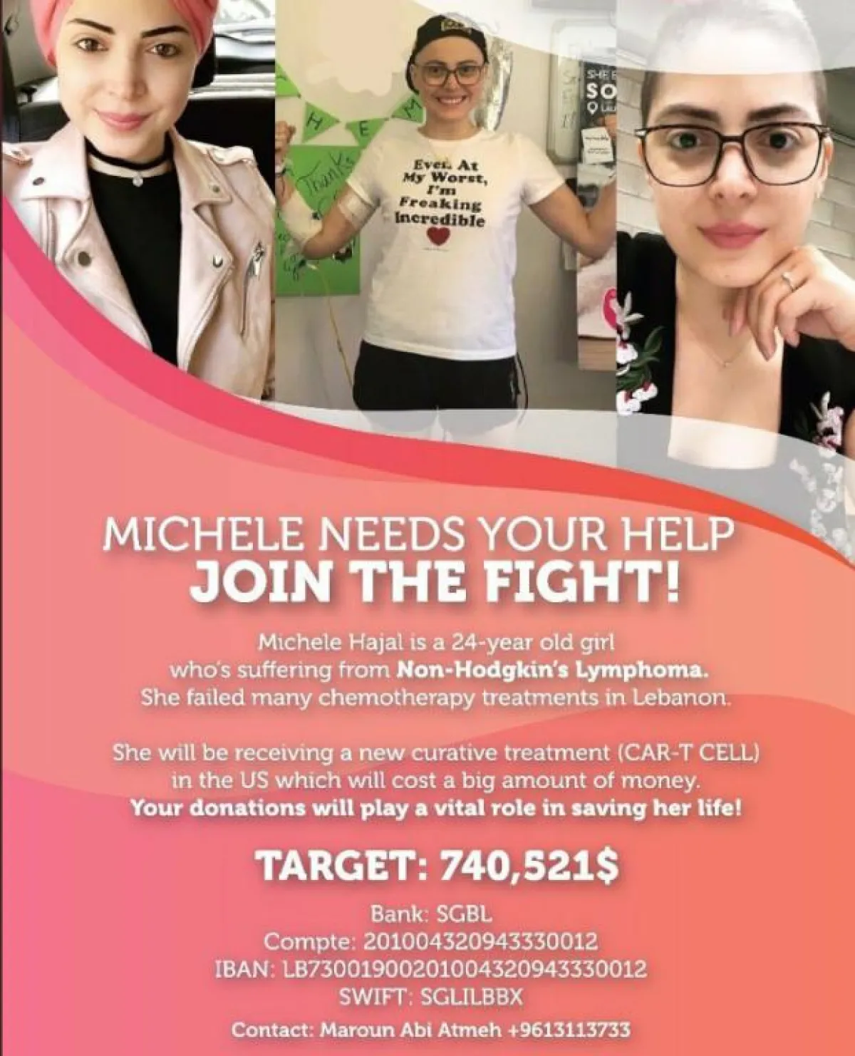 يذكر أنه أطلقت حملة عبر "السوشيال ميديا" للمساهمة في علاج ميشيل حجل، التي بلغ من العمر 24 عاماً، والتي كانت قد أعلنت عن خطوبتها قبل أن تكتشف إصابتها بمرض السرطان في الغدد اللمفاوية.