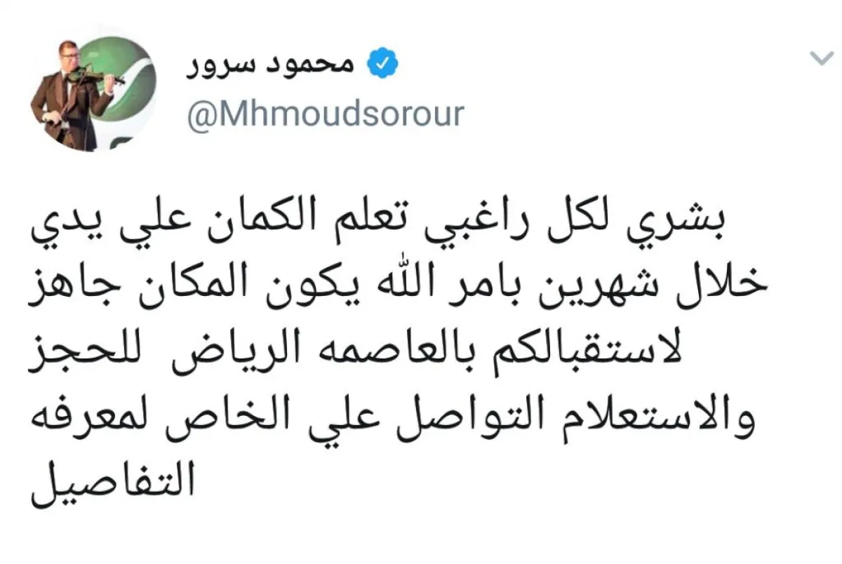 أطلق عازف الكمان الشهير محمود سرور بشرى لمتذوِّقي الفن من الجمهور السعودي، وذلك بتغريدة عبر "تويتر"، حيث أبدى جاهزيته لإطلاق دورة تعلُّم العزف على آلة الكمان، وهي الآلة التي اشتهر بها، مشيرًا إلى عزمه ونيَّتِهِ لاستقطاب محبي العزف لهذه الدورة، حيث كتب "بشرى لكل راغبي تعلُّم الكمان على يديّ.. خلال شهرين بأمر الله يكون المكان جاهزًا لاستقبالكم بالعاصمة الرياض".