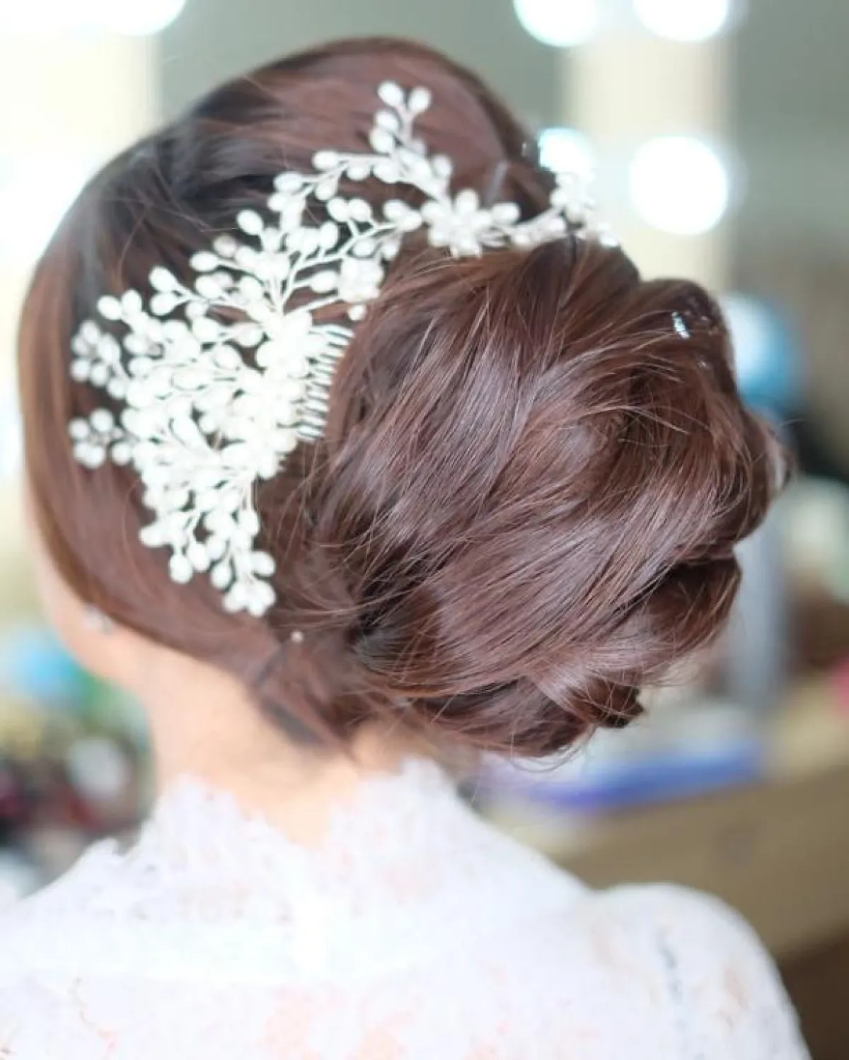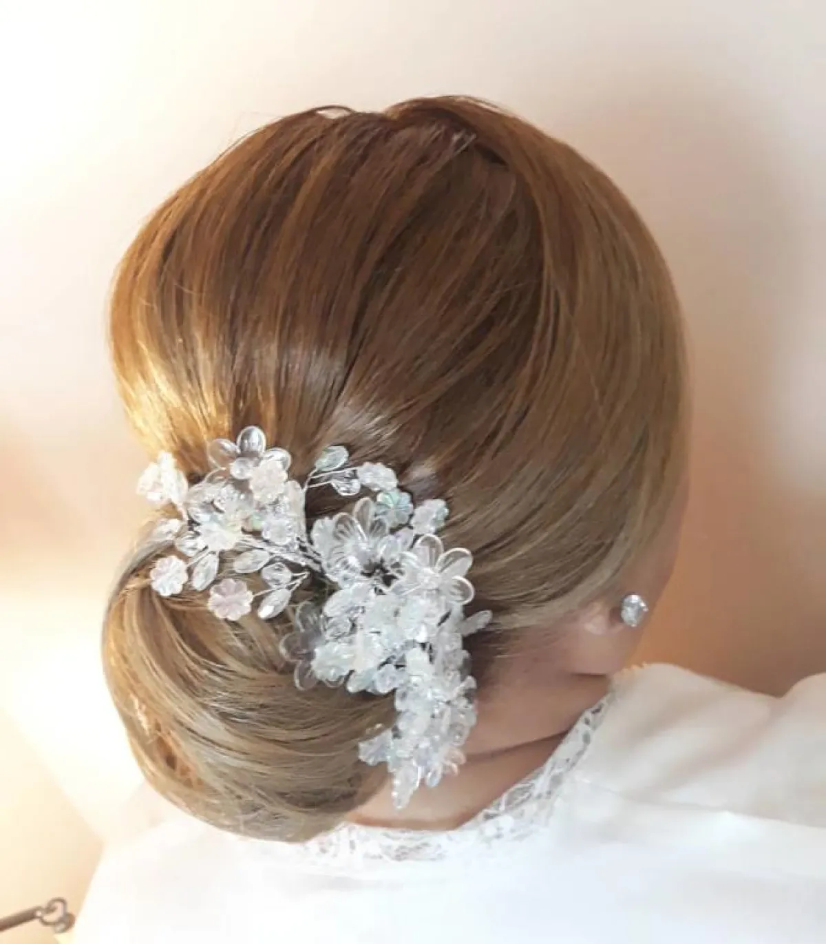 تسريحة الكعكة المنخفضة تحتاج لتزيينها بـ اكسسوار الشعر الفضي، المرصع بالأحجار، مع فستانكِ الفخم، يمكنكِ اختيار تصميم بحجم متوسط، لتبرزي جماله، على أن تنسدل الطرحة من الاكسسوار.