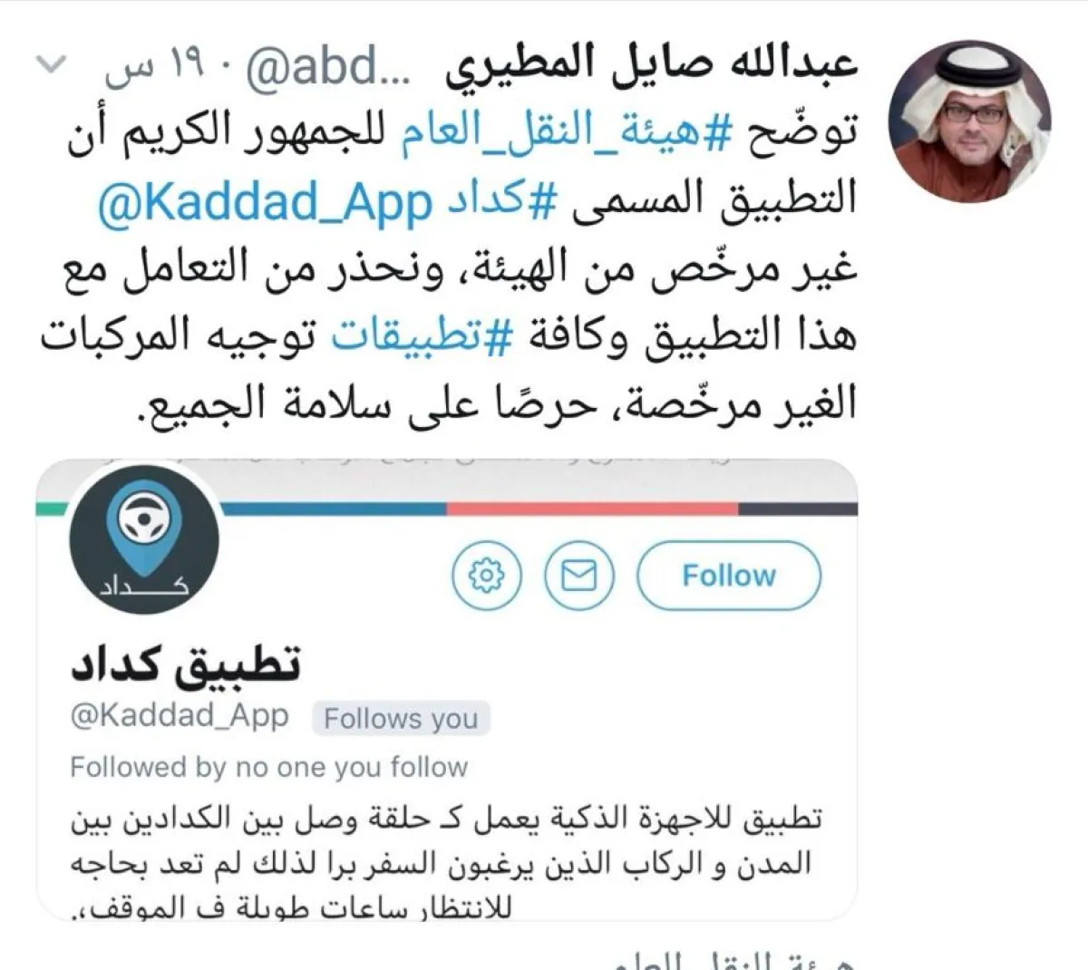 حذر المتحدث الرسمي لهيئة النقل العام عبد الله المطيري، بتغريدة عبر حسابه بتويتر، من التعامل مع تطبيق"كداد"، وأكد: أن التطبيق غير مرخص من هيئة النقل العام.