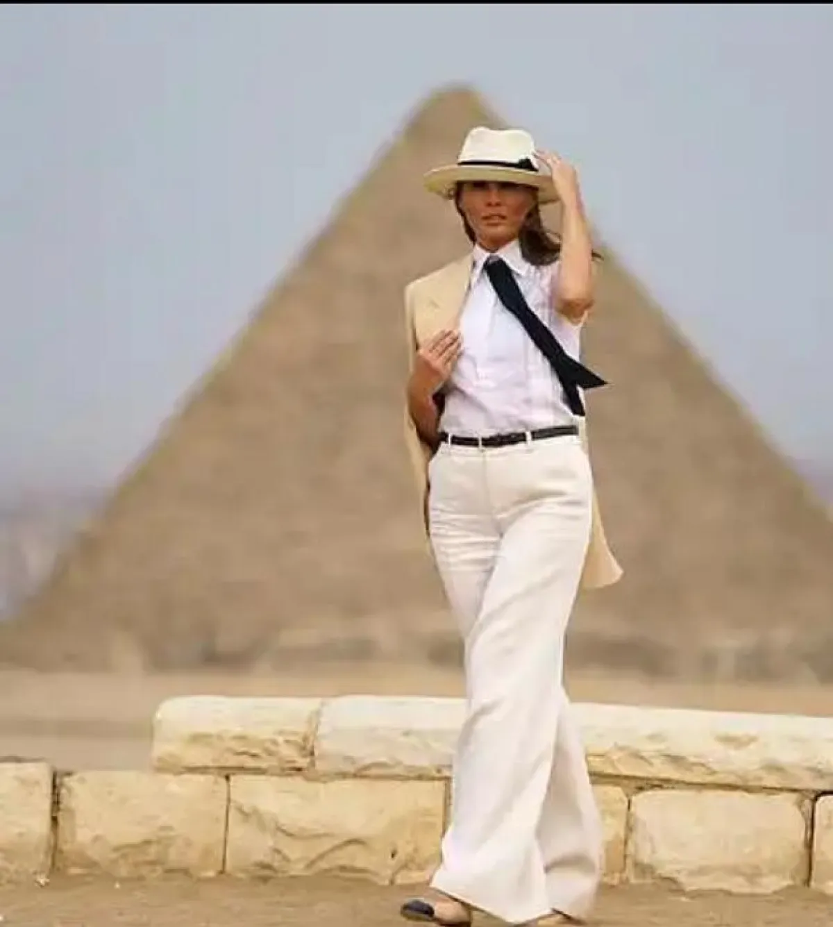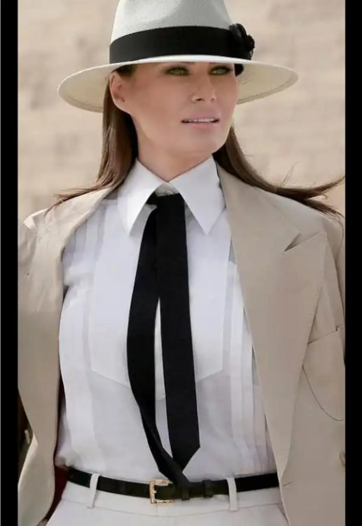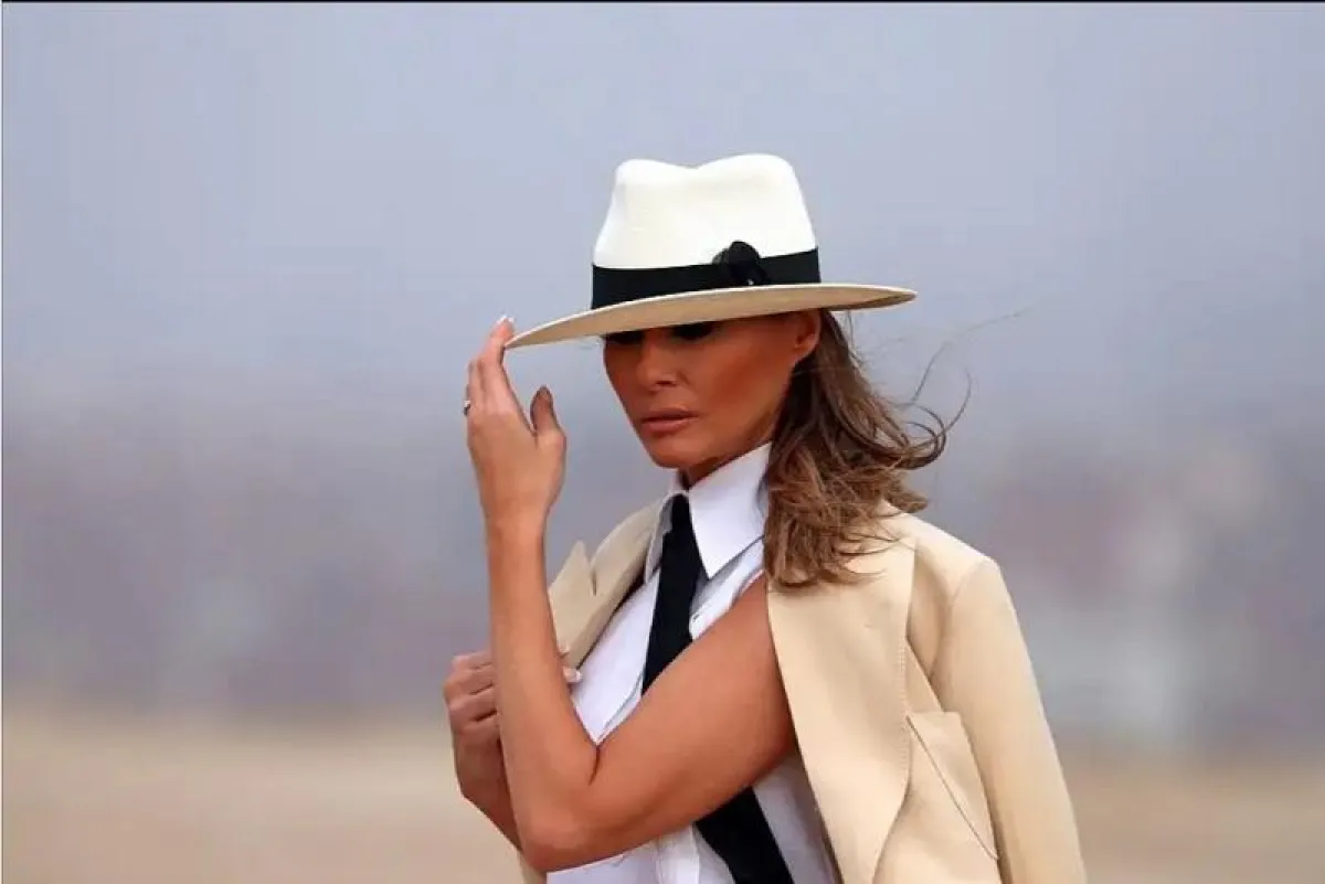 وظهرت السيدة ترامب في هذه المناسبة بإطلالة عصرية ببدلة السفاري الكلاسيكية ، حيث اختارت سترة باللون البيج فوق قميص أبيض، وربطة عنق سوداء ، وسروال كريمي اللون . وأكملت إطلالتها بقبعة فيدورا مطابقة للبدلة.