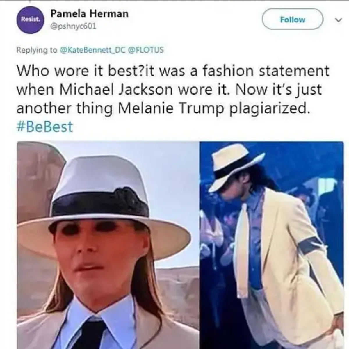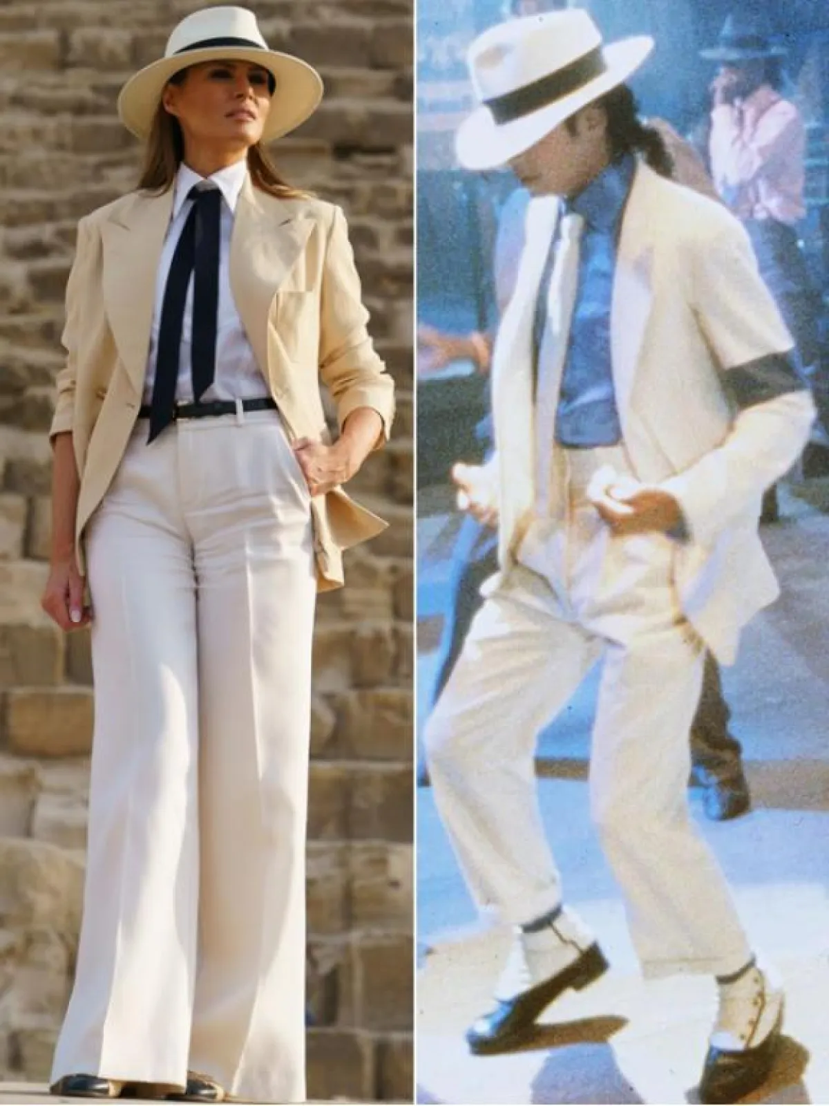 إلا أن إطلالة ميلانيا لم تمر مرور الكرام ، ليس فقط بسبب أسلوبها بل لأنها أعادت إلى الأذهان البدلة التي ارتداها المغني الراحل مايكل جاكسون في فيلمه "السلسة الجنائية" عام 1988.