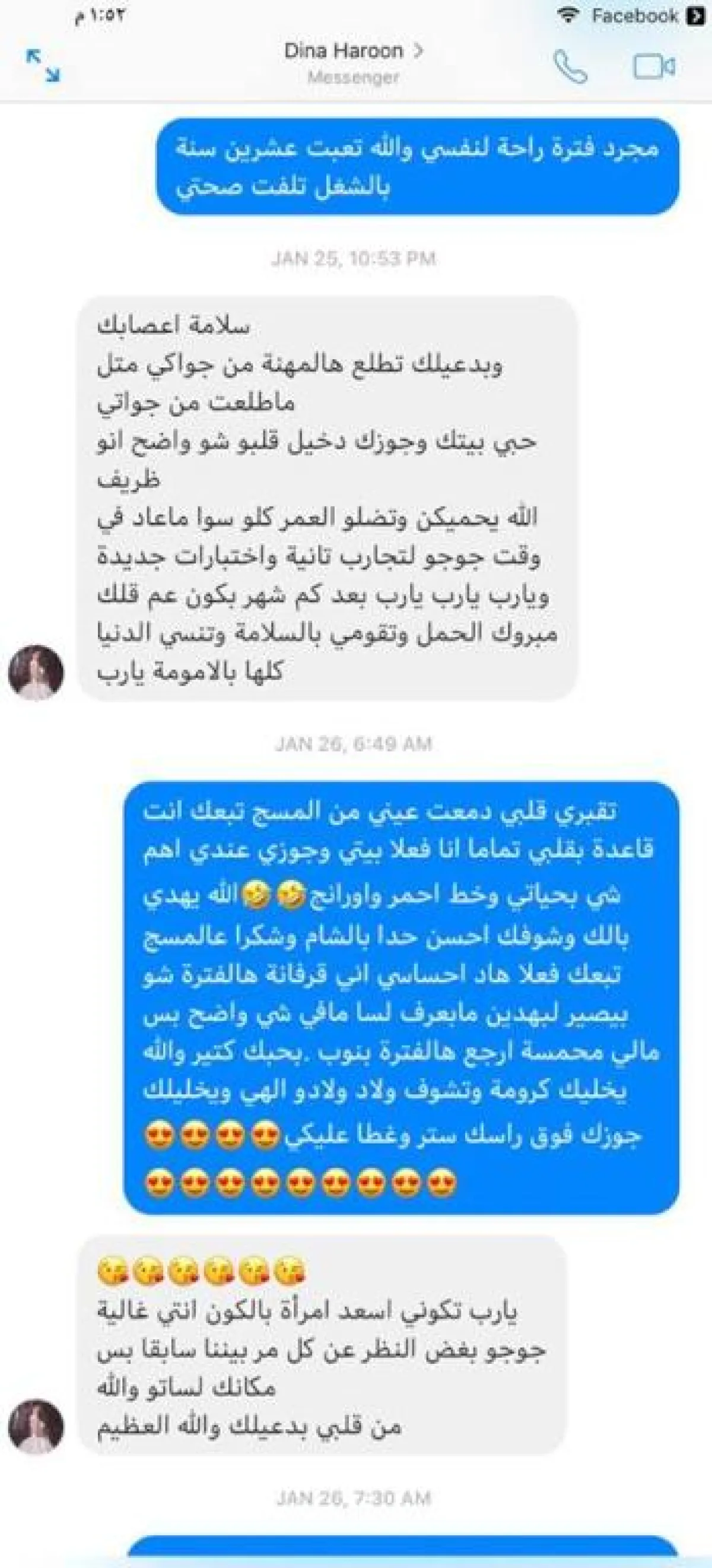 ودارت المحادثة بين جيهان و دينا حول ابتعاد الأولى عن التمثيل خلال الفترة الحالية لتؤكد جيهان انها بحاجة للراحة وترد عليها دينا بهذه الرسالة: "سلامة أعصابك .. وبدعيلك تطلع هالمهنة من جواتك متل ما طلعت من جواتي .. حبي بيتك و جوزك دخيل قلبو شو واضح أنو ظريف .. الله يحميكن و تضلوا العمر كلو سوا .. ما عاد في وقت جوجو لتجارب تانية واختبارات جديدة .. ويارب يارب بكون عم قلك مبروك الحمل و تقومي بالسلامة وتنسي الدنيا كلها بالامومة يارب " .