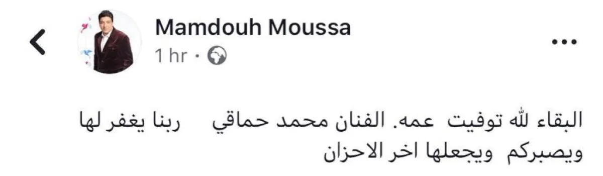 أعلن ممدوح موسى، عبر حسابه الشخصي عبر موقع الفيس بوك، عن وفاة عمة الفنان محمد حماقي "شقيقة والده"، فجر اليوم الثلاثاء وكتب ممدوح: البقاء لله، توفيت عمة الفنان محمد حماقي، ربنا يغفر لها ويصبركم ويجعلها آخر الأحزان.