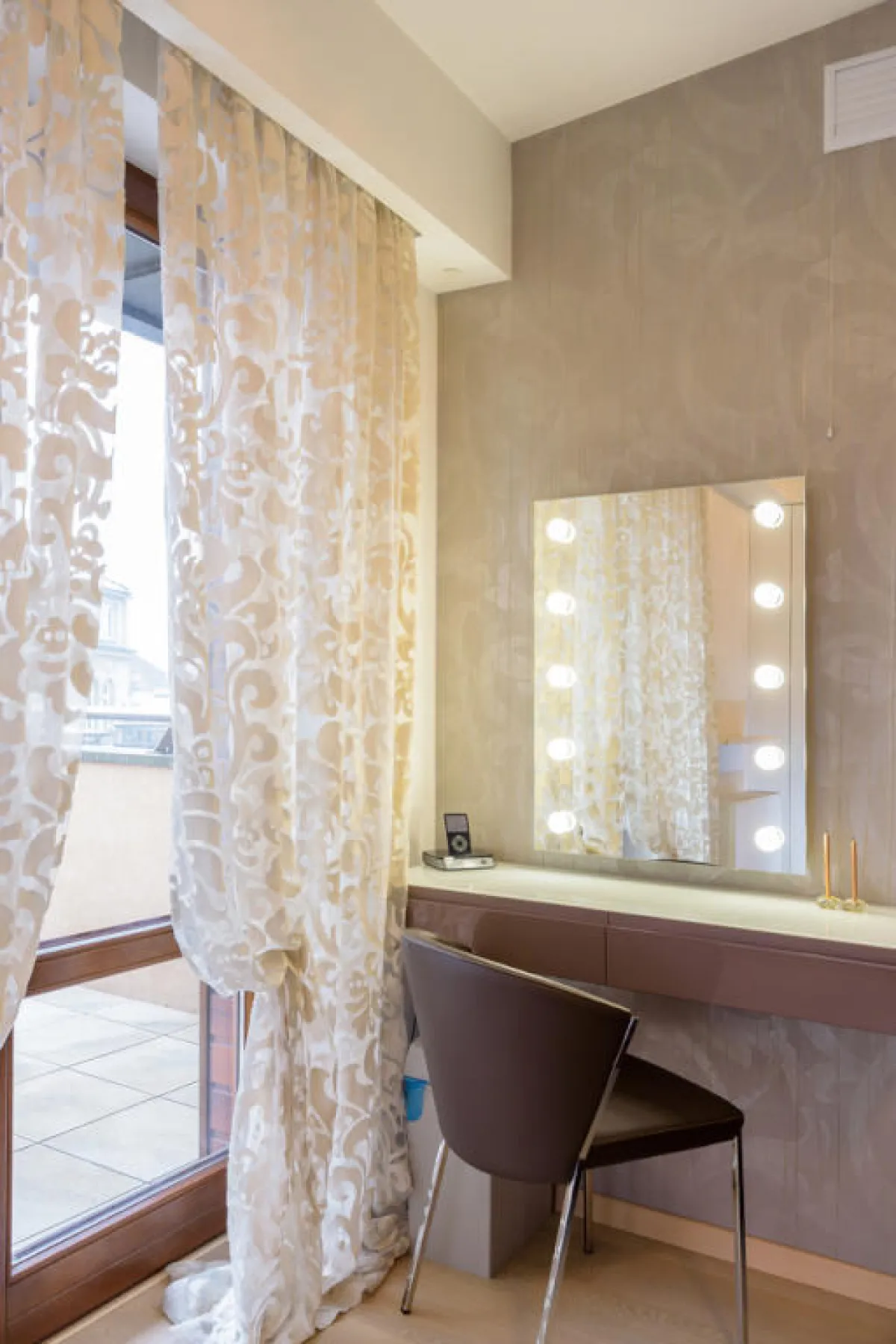 2. يُثبَّت رفٌّ من الخشب بلون فاتح على أحد جدران غرفة النوم لغرض التبرُّج، على أن يتقدَّمه كرسي خشب بسيط من دون ذراعين، وأن تعلو الرفَّ مرآة عصريَّة التصميم وكبيرة الحجم، بهدف إعطاء انطباع بأنَّ المجال واسع.