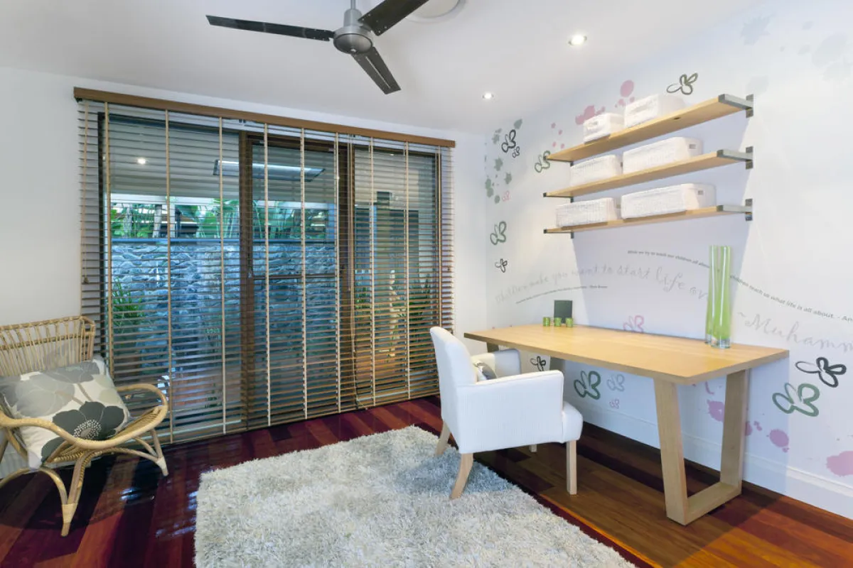 3. يُثبَّت رفٌّ على أحد جدران غرفة المعيشة أو غرفة النوم، ويمكن أن يُزوَّد بدرج سحَّاب يحمل على سطحه الـ"لابتوب"، وإضاءة جانبيَّة مخصَّصة للقراءة، لغرض العمل في المنزل.