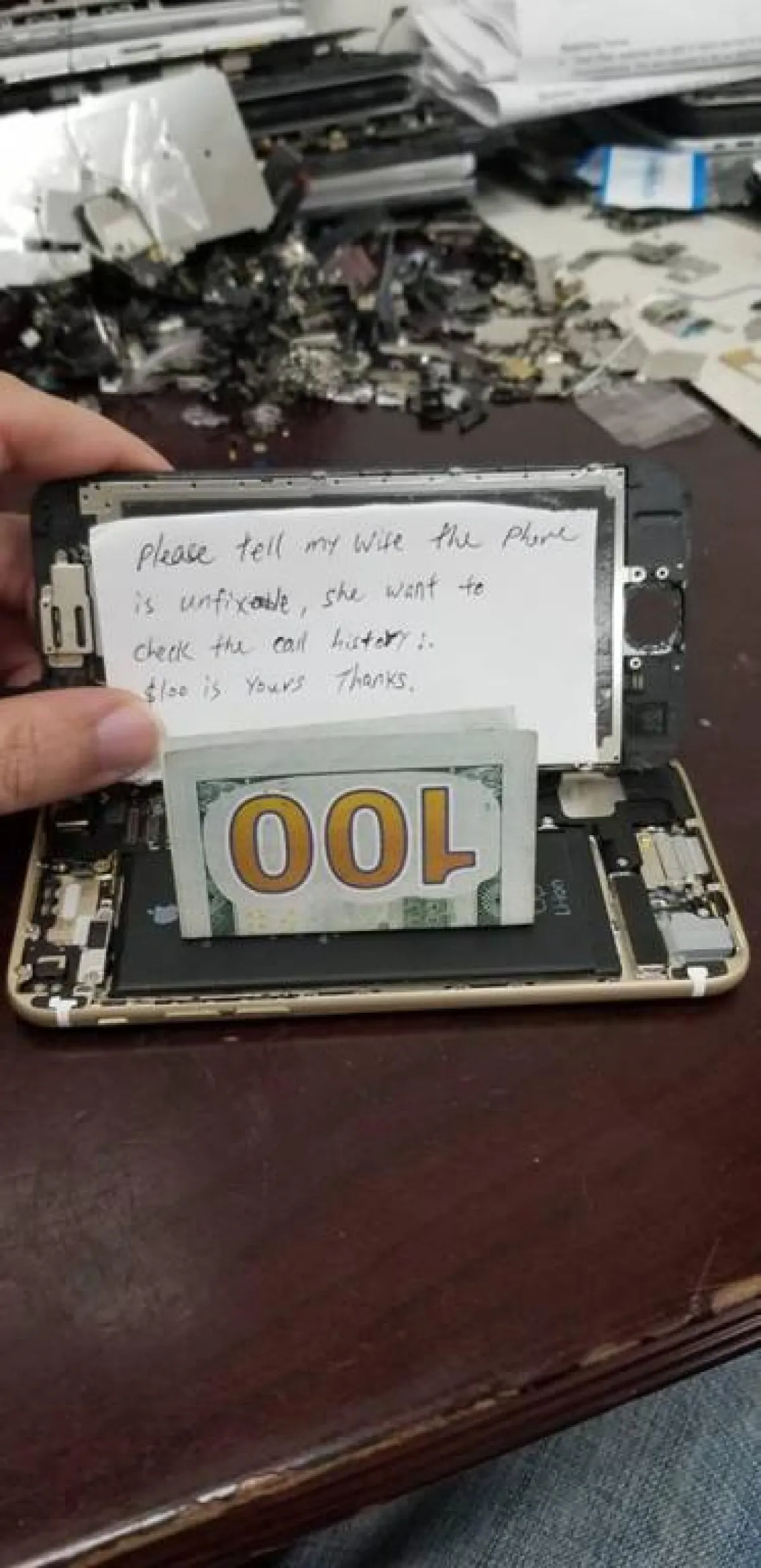 فقد تداولت العديد من وسائل الإعلام ومواقع التواصل الاجتماعي، ما نشره موظف في خدمة إصلاح الهواتف الذكية في مدينة شنغهاي في الصين، ويُدعى لي جيانغ، على صفحته الشخصية عبر "فيسبوك"، لصورة هاتف أحد الزبائن لديه، والذي كان بداخله رسالة غريبة بالإضافة إلى ما يمكن اعتباره "رشوة" بمبلغ 100 دولار.
