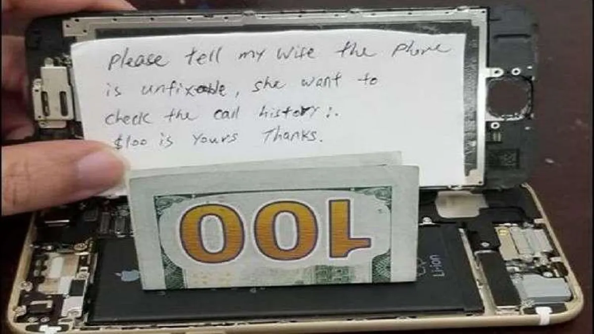 "من فضلك أخبر زوجتي أنه لا يمكن إصلاح الهاتف، لأنها تريد التحقق من سجل المكالمات، و100 دولار لك. شكراً".