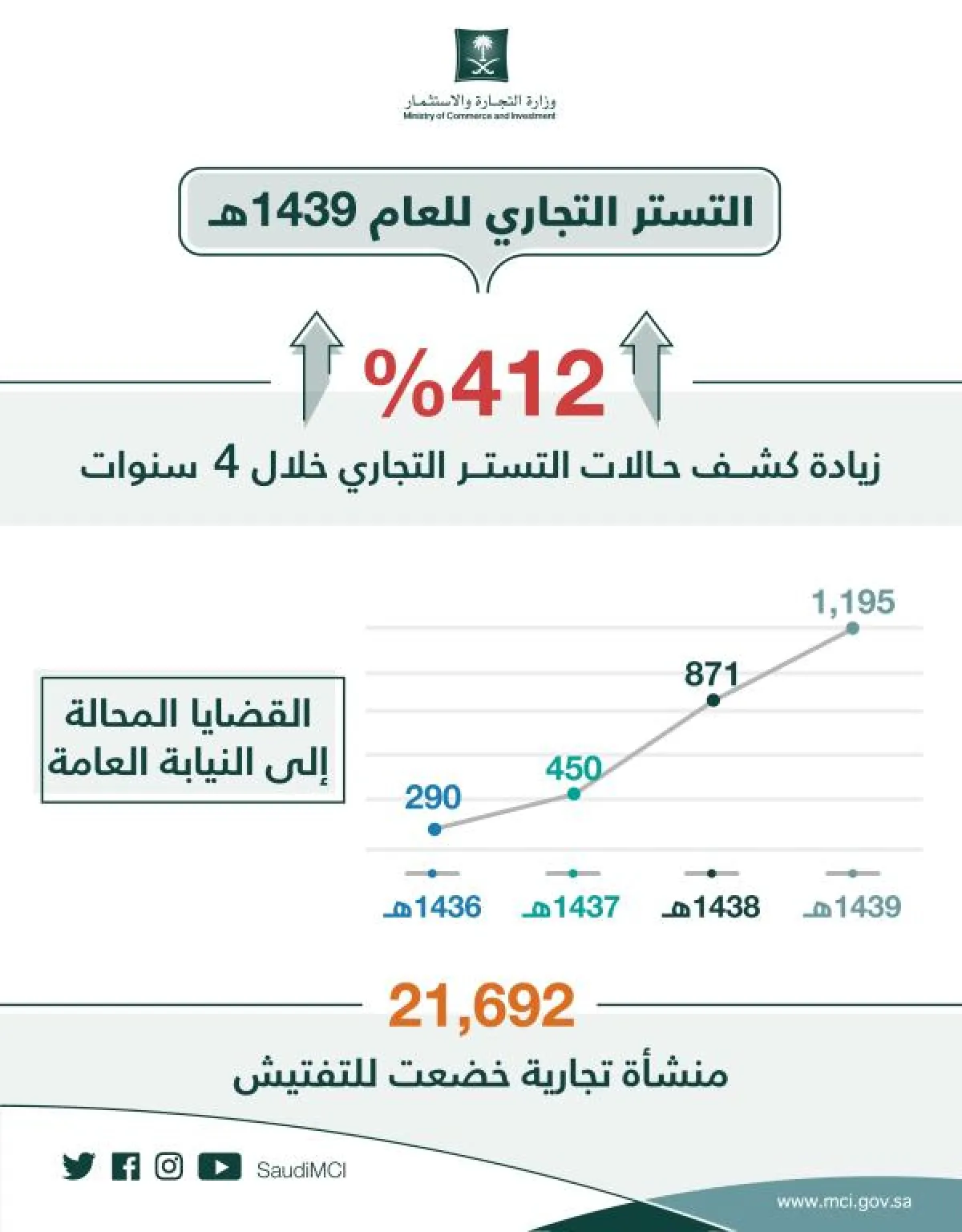 أعلنت وزارة التجارة والاستثمار زيادة الكشف عن مخالفات نظام مكافحة التستر خلال الأربع سنوات الماضية بنسبة 412% حيث قادت نتائج الجولات التفتيشية للوزارة إلى إحالة (1195) قضية تستر إلى النيابة العامة خلال العام 1439هـ وذلك لاستكمال تطبيق العقوبات النظامية على المخالفين والتي بدورها ستقوم بالإحالة إلى الجهات القضائية لإصدار الأحكام النهائية.