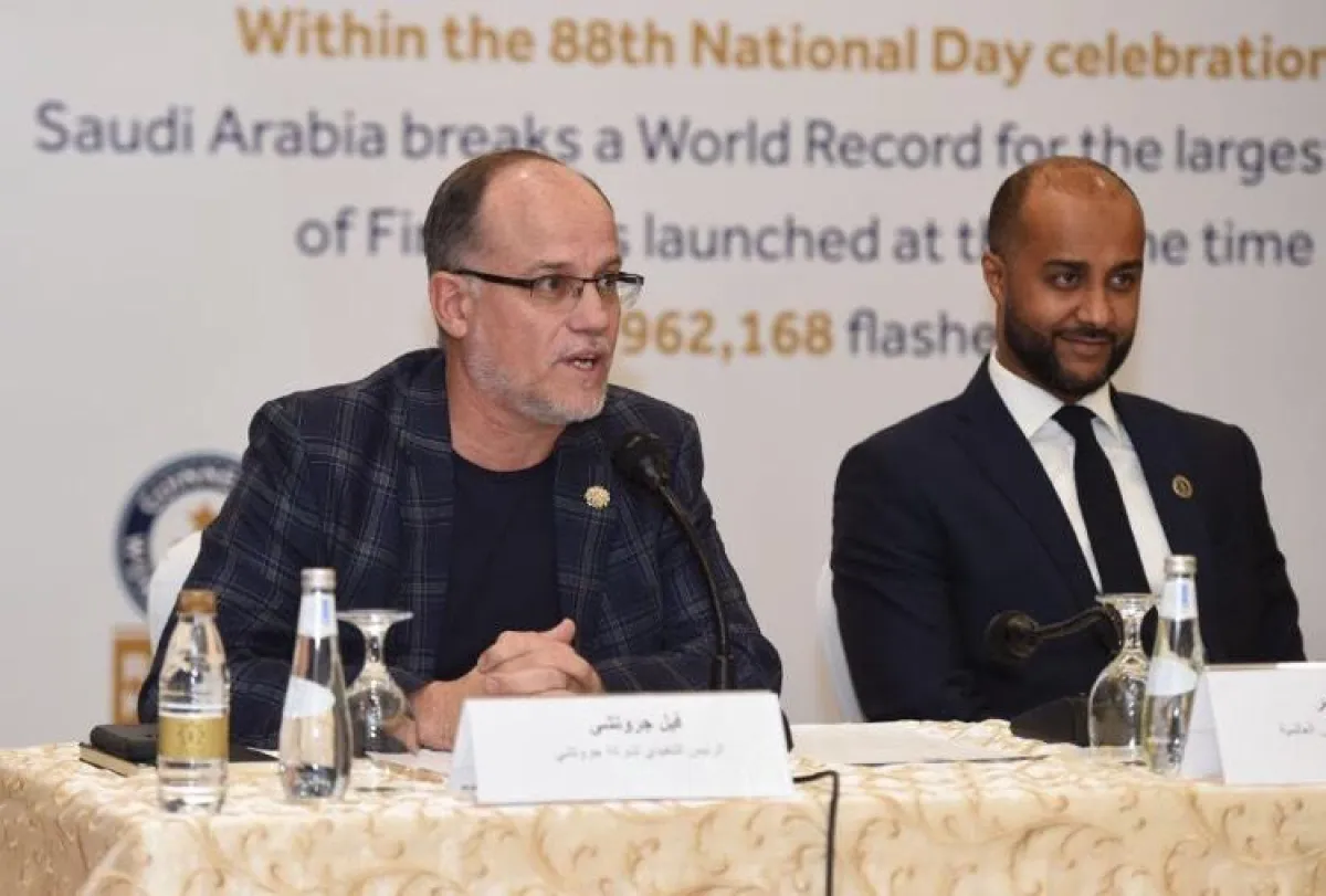 وكان السيد "فيل جروتشي"، الرئيس التنفيذي لشركة "جروتشي"، وهو الشريك الدولي لتحقيق الرقم القياسي في الترفيه، قد بدأ حديثًه شاكرًا الإنجاز الذي صنعته الهيئة، بما فيها منسوبوها، الذين عملوا لوقت طويل من أجل الوصول لهذا الإنجاز، وأضاف أن شركة "جروتشي" تعمل من عام 1850 في مجال الألعاب النارية، وتفتخر بوجودها في السعودية، وسعيدة بهذا المستوى المقدَّم في هذه المناسبة الوطنية.