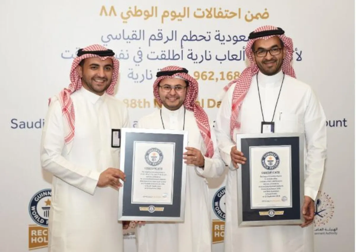 حققت الهيئة العامة للترفيه إنجازًا كبيرًا، يتمثَّل في تحطيم الرقم القياسي لأكبر كمية ألعاب نارية أُطْلِقَتْ ضمن احتفالات اليوم الوطني الـ88، حيث أُطْلِقَتْ 962168 ومضةً نارية، ليقتحم ذلك الرقم آفاقَ موسوعة "غينيس" للأرقام القياسية.