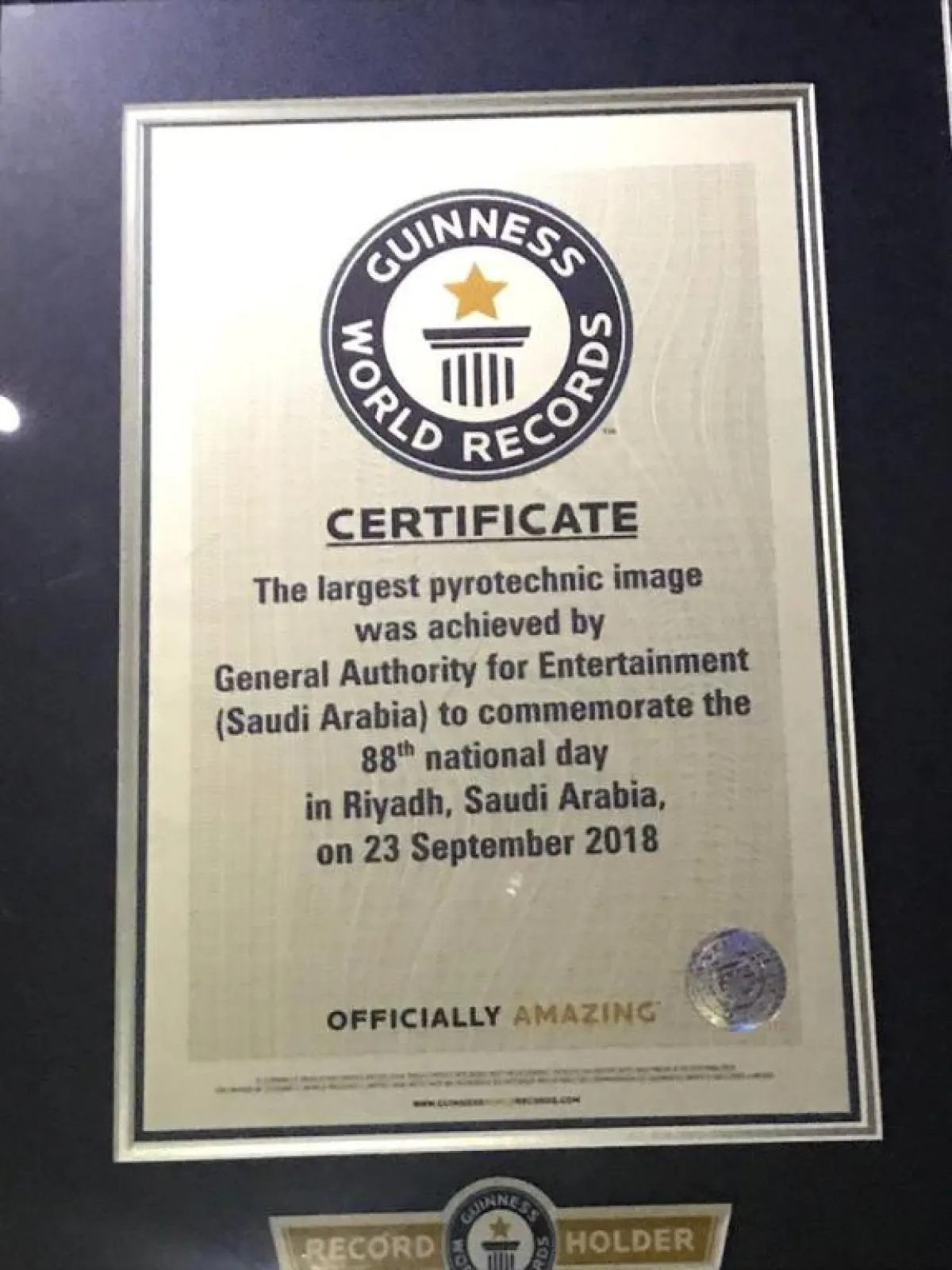 وتحدَّث الأستاذ طلال عمر، ممثِّل موسوعة "غينيس"، عن تاريخ مراحل تطوُّر الرقم القياسي؛ مبيِّنًا أنه في عام 2013 كان الرقم القياسي المسجَّل هو 70 ألف طلقة نارية، ومرورًا بعام 2014 تمَّ كَسْرُ هذا الرقم في الإمارات، وتحديدًا في إمارة "دبي"، بحوالي 470 ألف ومضة نارية، وبعد ذلك تمَّ كسر الرقم في النرويج، إلى أن تمَّ كسره مؤخرًا في عام 2016 في الفلبين، بما يقارب أكثر من 800 ألف ومضة نارية. وأضاف طلال أن عروض الألعاب النارية دائمًا ما تحبس الأنفاس؛ لجمالية المنظر وروعته، وهو ما حرصت عليه هيئة الترفيه؛ من أجل الاستمتاع بعروضها في مناطق المملكة كلها، وهو جهد أشهرٍ طويلة من المُثَابَرَةِ لنجاح هذه الفعاليات، والنجاح الذي حقَّقَتْه هيئة الترفيه اسْتَحَقَّتْهُ بجدارة. وبعد الاطِّلاع على جميع الأدلة التي تمَّ تقديمها، فنحن فخورون بانضمام السعودية إلى الموسوعة العالمية، بتحطيمها الرقم القياسي، عبر 952168 ومضةً نارية في مختلف مناطق المملكة.