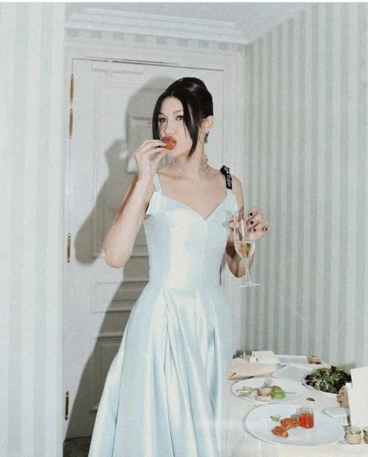 وهو من توقيع ديور Dior مع بروز التصميم الذي يضغط على منطقتي الصدر والبطن ليكونا مشدودين، بينما جاء باقي الفستان منفوشًا قليلًا بسبب بطانة التول المنفوشة.