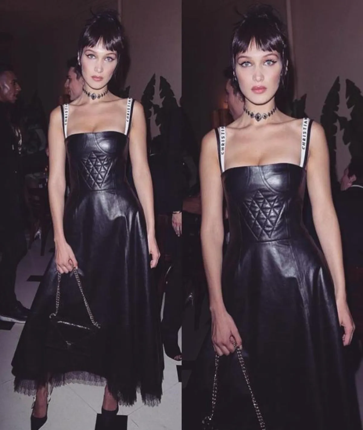 حتى مع الفساتين البسيطة، يبدو أن بيلا لا تشعر بالراحة إلا مع الكورسيه، كالفستان الأسود الميتاليك المطرز بالترتر والخرز الصغير، جاء ضيقًا من ناحية الصدر والخصر، وبفتحة ساق كبيرة تبرز طول بيلا، وعادة ما تختار مع هذا النوع من الفساتين رفع شعرها للأعلى، لكي تبرز منطقة الصدر لديها.