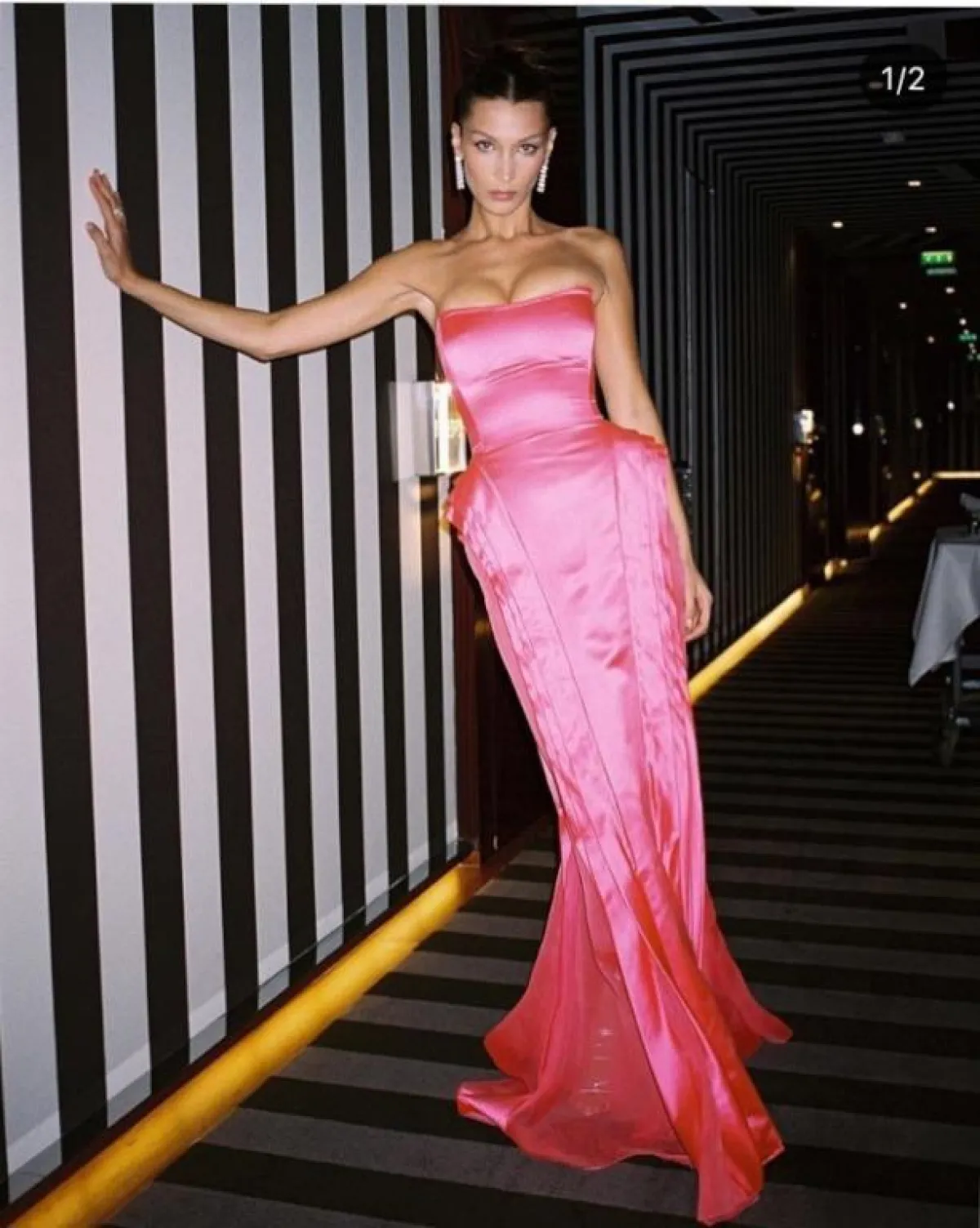 في واحدة من آخر إطلالاتها، ظهرت بيلا بفستان باللون الفوشي، أحد ألوانها المفضلة ، إذ شاهدناه بهذا اللون في أكثر من إطلالة، جاء الفستان بتصميم الكورسيه من دون أكمام، جريئًا من ناحية الصدر، يتسع قليلًا أسفل الخصر، بثنيات من الجانبين تضيف بعض الحجم لإطلالة بيلا النحيفة، حتى بدا جسدها كالساعة الرملية .