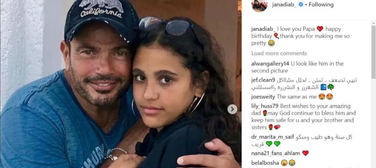 احتفلت جنا دياب ابنة الفنان عمرو دياب بعيد ميلاده بنشر صورة تجمعها به عبر "انستقرام"، وعبّرت في تعليقها على الصورة عن حبها الشديد له.