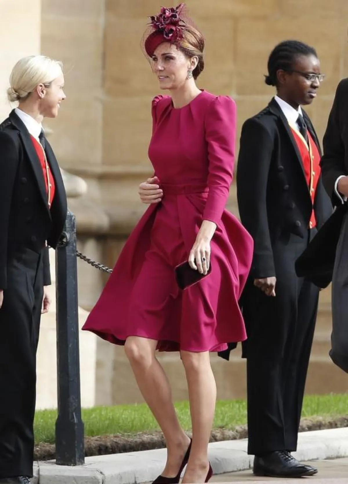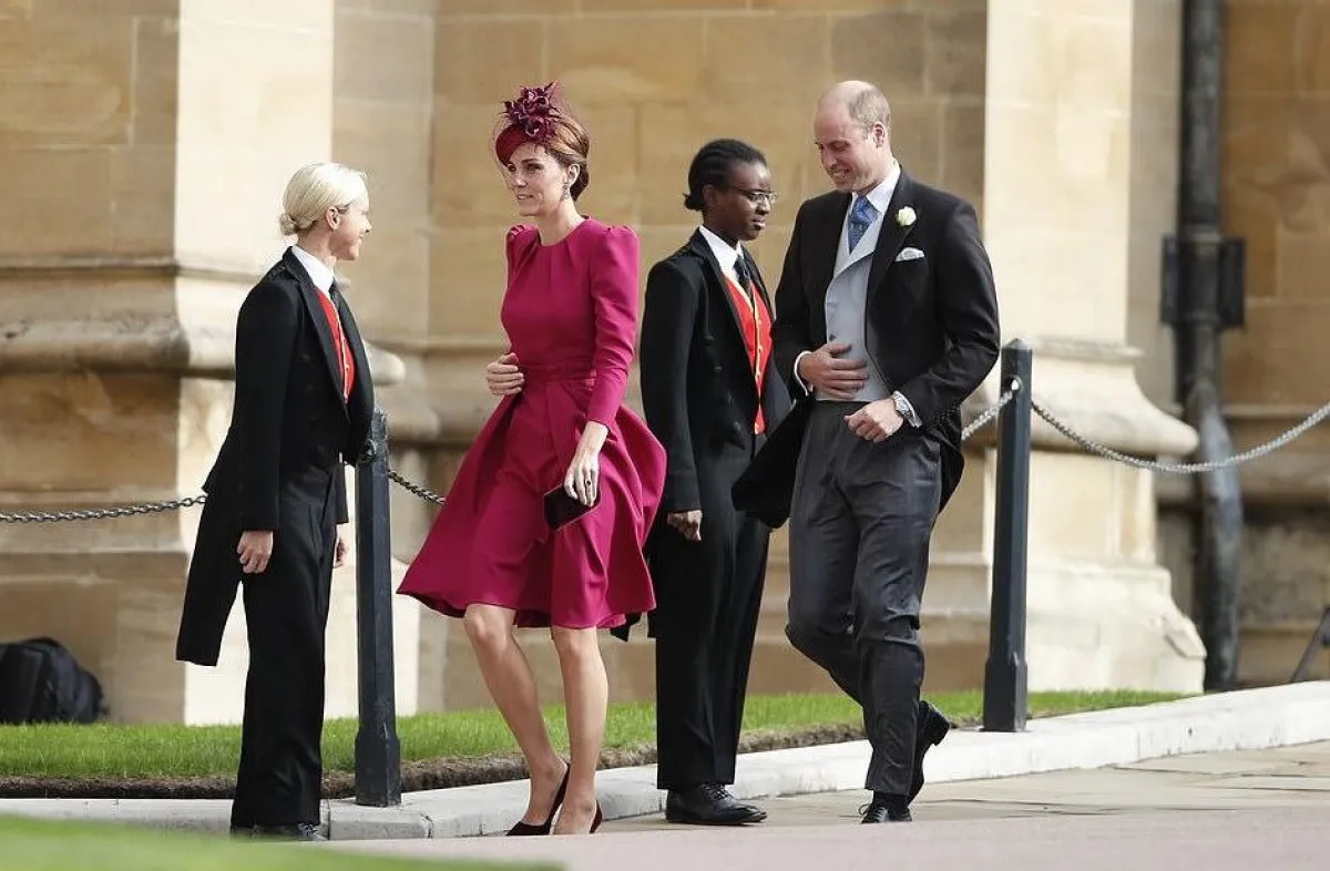 اطلالة أنيقة اختارتها كايت ميدلتون Kate Middleton لحفل زفاف الأميرة أوجيني حيث تألقت في فستان ميدي من الحرير باللون الأورجواني من الكسندر مكوين Alexander McQueen نسقت معه قبعة أنيقة مزينة بالورود وأكملت اللوك بحذاء وحقيبة يد من المخمل باللون العنابي الداكن.