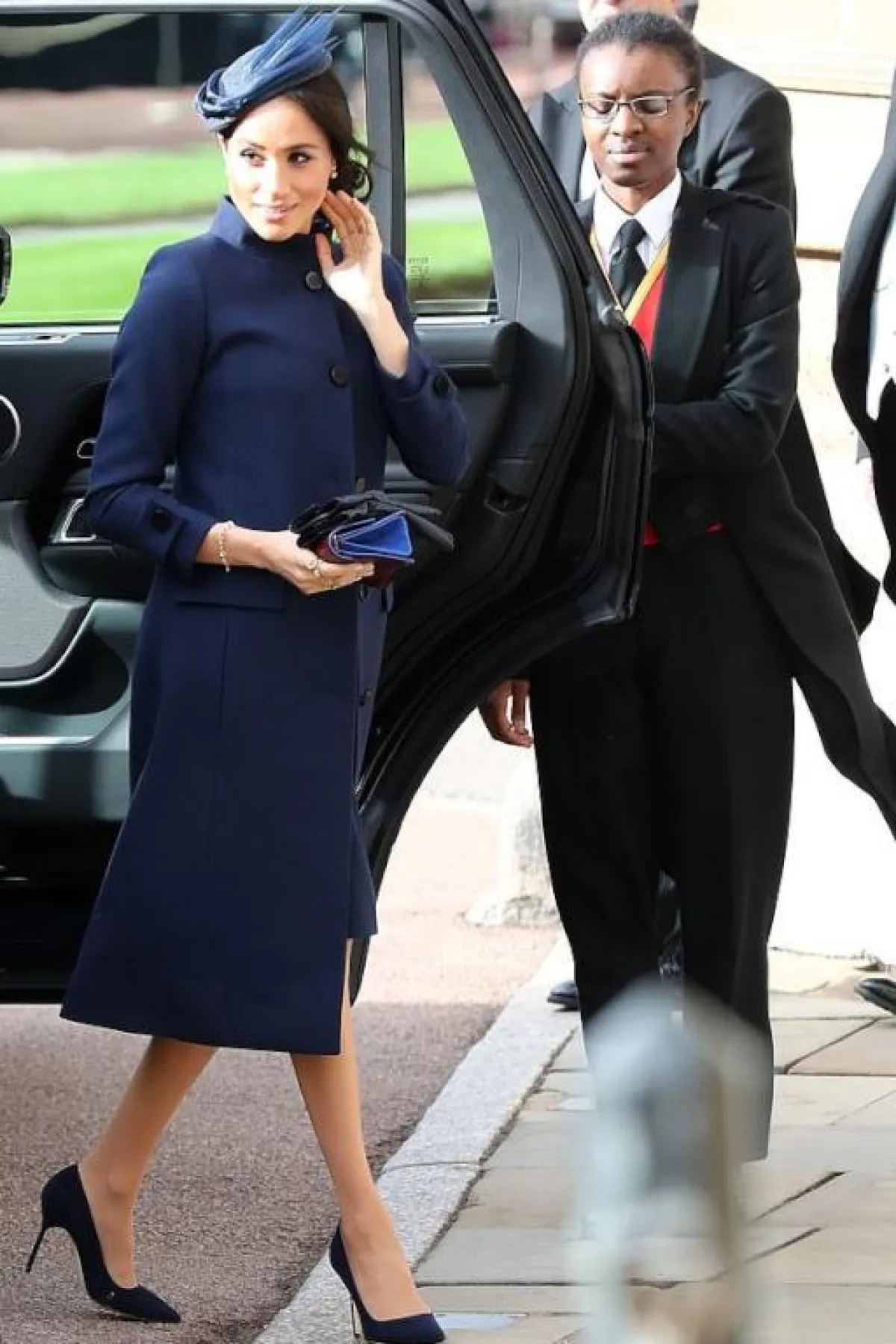 ميغان ماركل Meghan Markle تألقت في اطلالة ناعمة اختارتها مثل العادة من جيفنشي Givenchy وكانت عبارة عن معطف طويل باللون الأزرق الداكن نسقت معه اكسسوار ملفت للرأس وشنطة يد صغيرة، واختارت مع اللوك حذاء كعب عالي ناعم.