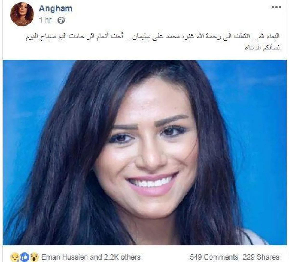 علّقت الفنانة أنغام على خبر مصرع أختها غنوة سليمان من خلال منشور لها عبر فيس بوك قالت فيه :"البقاء لله .. انتقلت الى رحمة الله غنوة محمد على سليمان، أخت أنغام اثر حادث اليم صباح اليوم، نسألكم الدعاء"، مع صورة نشرتها أنغام إلى جانب التعليق. وتعد هذه المرة الأولى التي تنشر فيها أنغام صورة لأختها عبر أي من حساباتها على مواقع التواصل الاجتماعي بسبب حالة العداء التي كانت بينهما واستمرت لسنوات طويلة.