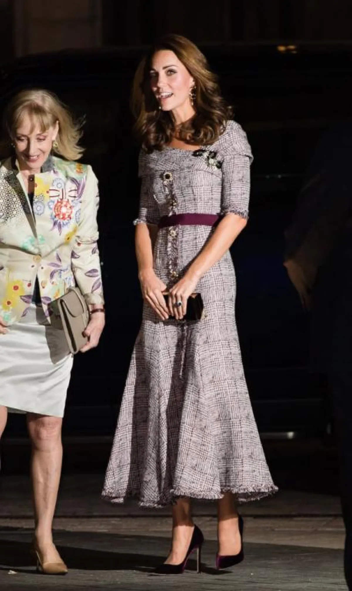 وقد ارتدت كيت ميدلتون مع هذا الفستان حزامًا باللون النبيذي، ونسقت معه حذاءً من Jimmy Chooوشنطة يد من العلامة نفسها.
