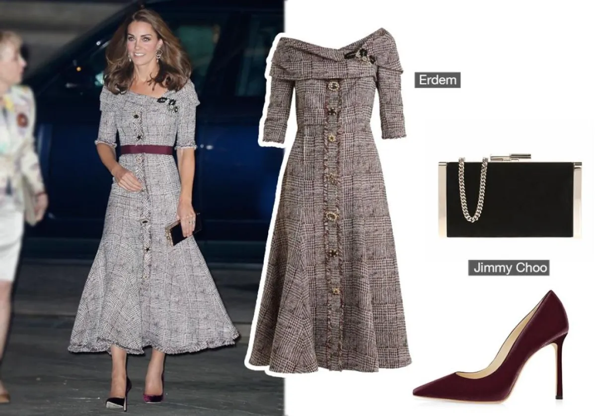 وتميز الفستان المصنوع من قماش التويد، بأنه مكشوف عند الأكتاف، ولديه أزرار منمّقة.