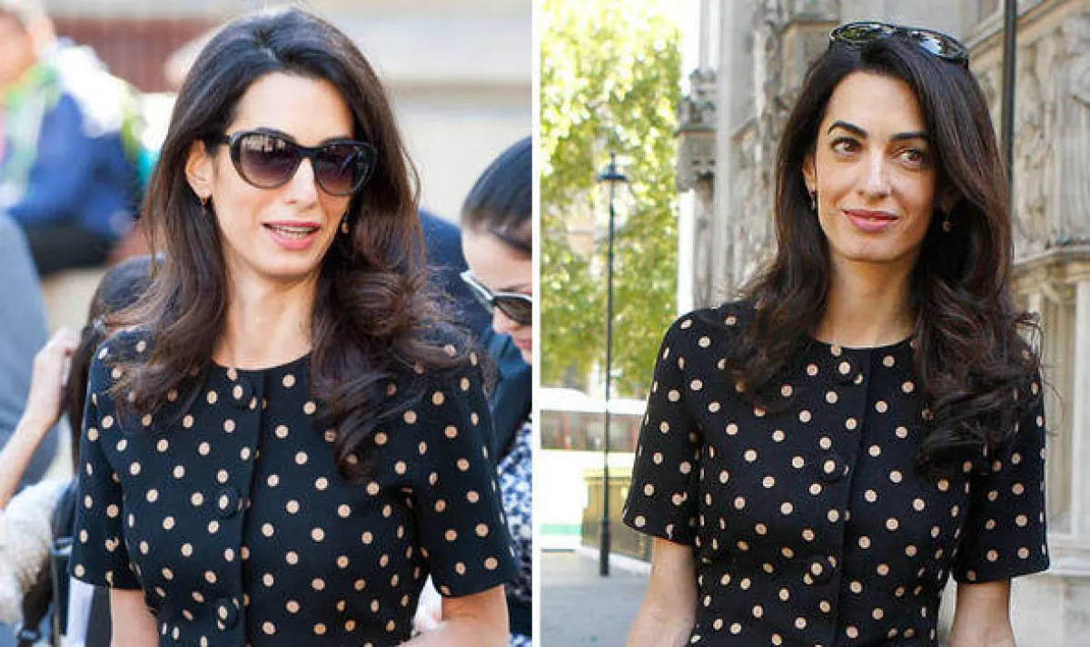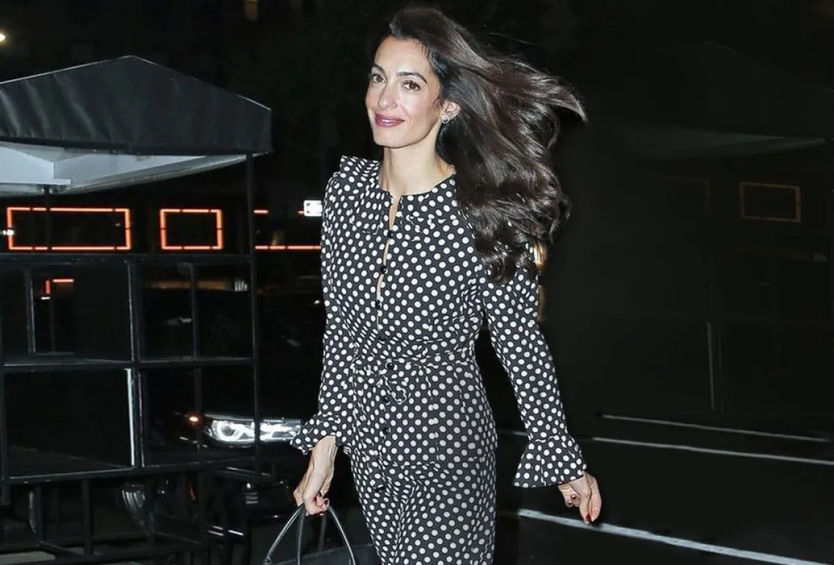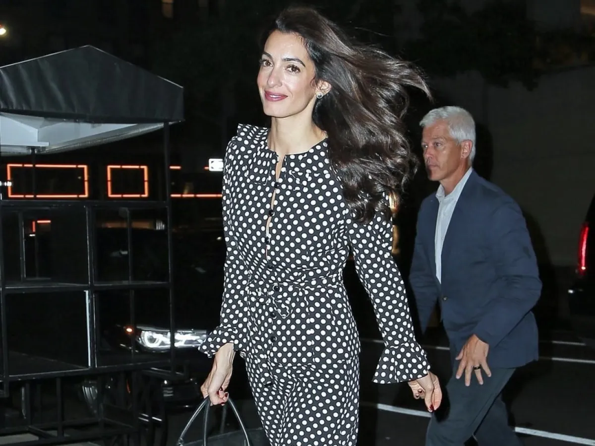 اعتمدت أمل كلوني صيحة البولكا دوتس بطريقة تتناسب مع أسلوبها العملي؛ حيث اختارت سترة متدفقة، مربوطة عند الخصر بـ حزام منسق مع نسيج السترة التي تزينت بكشاكش طفيفة عند الأكمام، ونسقتها مع تنورة ميدي متطابقة، وحقيبة سوداء كبيرة الحجم تتناسب مع المستندات القانونية التي تصطحبها معها في جلسات الأمم المتحدة أو داخل قاعة المحكمة، أما الحذاء فاعتمدت صيحة الـpump باللون الأسود.