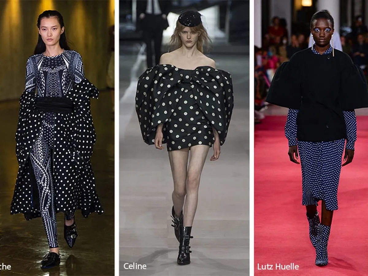 قدمت دار Koche مزيجاً غير معتاد من نقاط صيحة البولكا دوتس لتزين تصميم جيمبسوت مع بـ معطف عصري، أما دار سيلين celine فقدمت فستاناً قصيراً بأكتاف عريضة، ومزجت صيحة البولكا دوتس بين الأبيض والأسود، وأخيراً دار lutzhuelle قدمت فستاناً منقطاً بالأبيض والأزرق مع بوت من النسيج والنقوش كليهما.