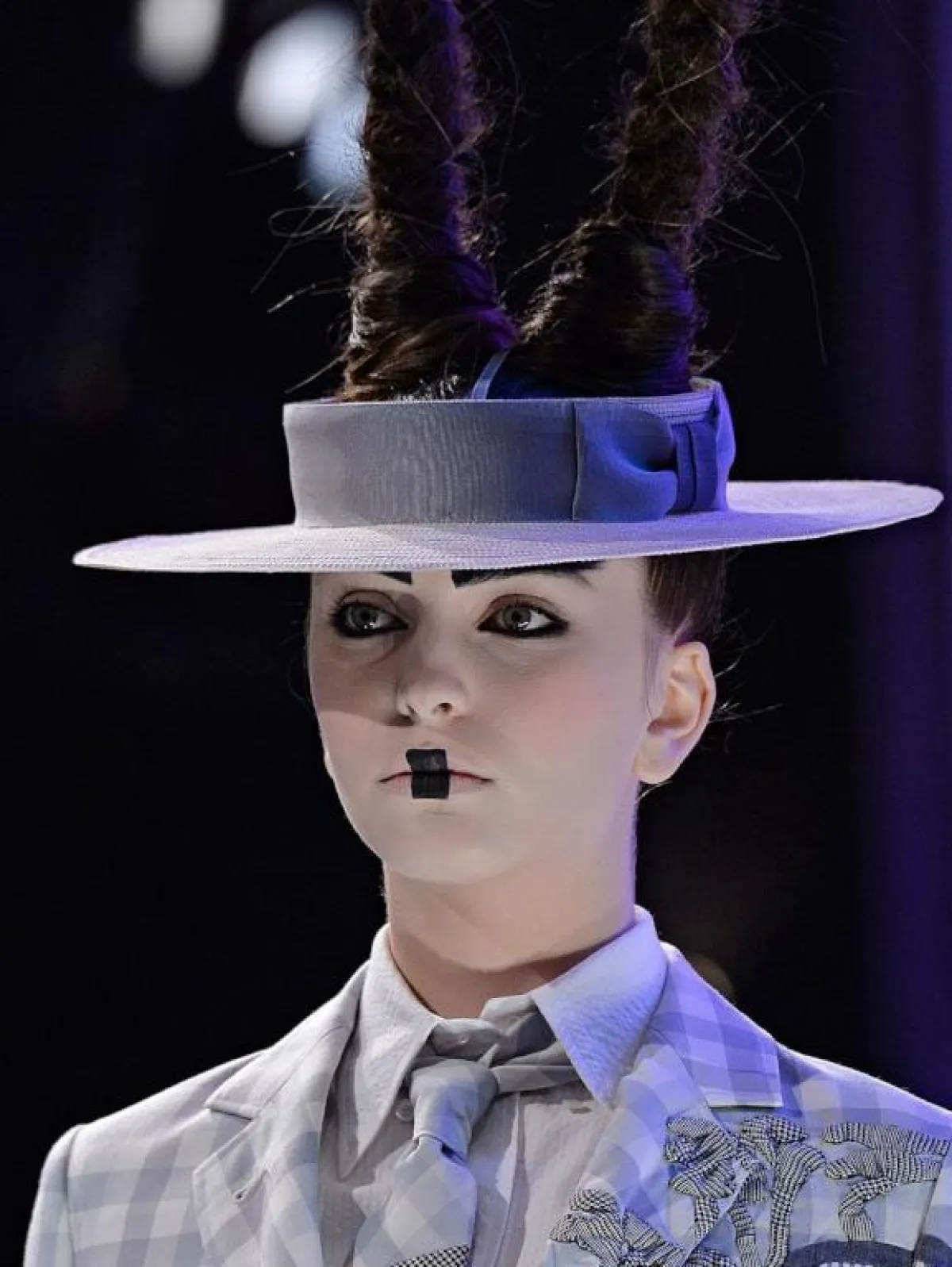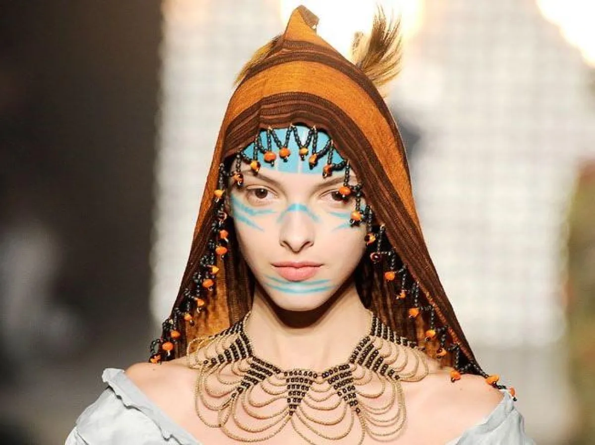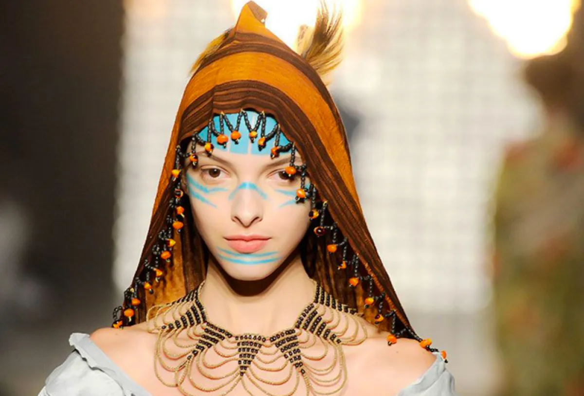 إذا كنت لا تحبين اللعب كثيرا بمساحيق التجميل، فكل ما أنت بحاجة إليه هذا اللوك من دار Vivienne Westwood فيفيان ويست وود، أن تستخدمي قلما باللون الازرق، للشكل الغجري أو البدوي، برسومات تحت العينين والذقن والجبهة، كمثال للمرأة القوية والجريئة.
