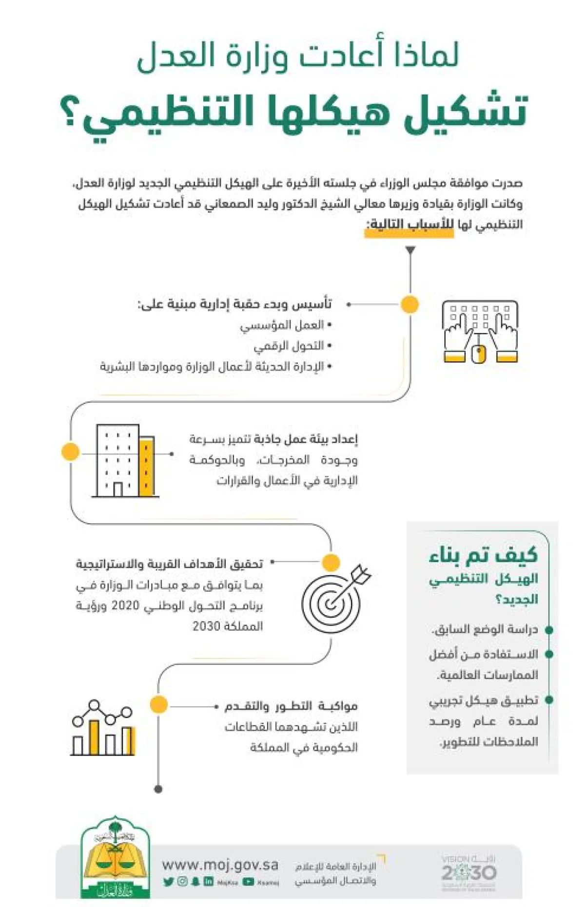 ولفتت الوزارة النظر إلى أن الهيكل الجديد، يعد أحد مخرجات برنامج التطوير العدلي الذي صمم وفقاً لأساليب ومحددات رؤية السعودية 2030، ويتضمن مشاريع تتعلق بالبنية التحتية والتطوير الإداري، والجودة والتميز المؤسسي، ومشاريع التحول الرقمي وتقنية المعلومات، والإجراءات وقياس الأداء، إضافة إلى مشاريع كفاءة الإنفاق.