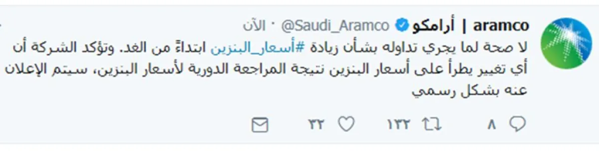 وأكدت "أرامكو"، عبر حسابها الرسمي على موقع التدوين المصغر "تويتر"، أنه لا صحة مطلقاً لرفع أسعار البنزين ابتداءً من الغد.