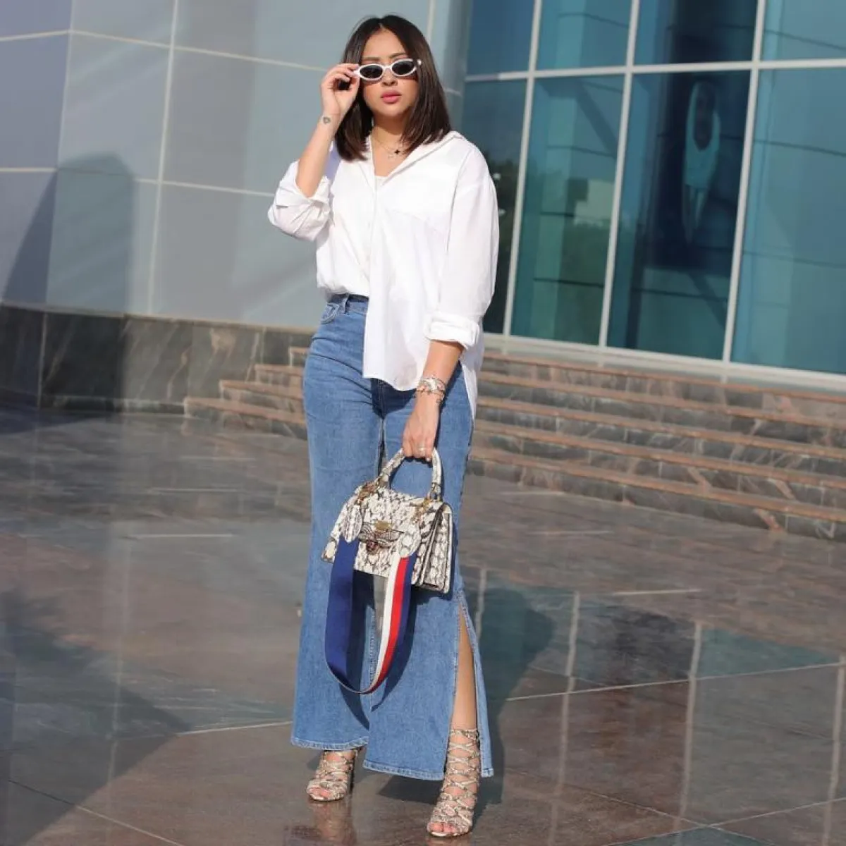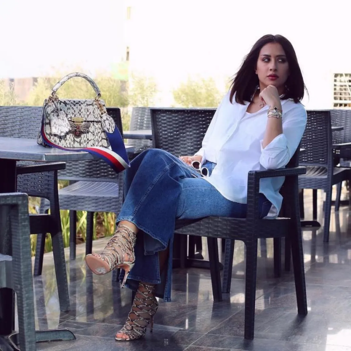 تميل النجمة الكويتية فرح الهادي إلى الاختيارت العصرية، فهي عادة من أيقونات الموضة اللاتي يبادرن باقتناء الجديد، لذلك اعتمدت فرح صيحة الجينز المزين بشق الساق واختارت الموديل الذي يمتد إلى الركبة ونسقت مع صندل من جلد الثعبان مزود بأربطة ممتدة إلى الكاحل مع حقيبة من جلد الثعبان أيضاً، واكتفت بهذه التفاصل القوية، لذا اختارت قطعة فوقية أساسية وهو القميص الأبيض الفضفاض.