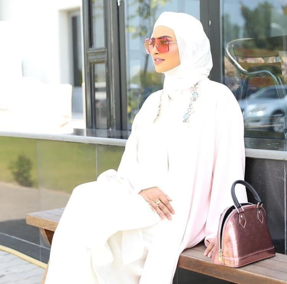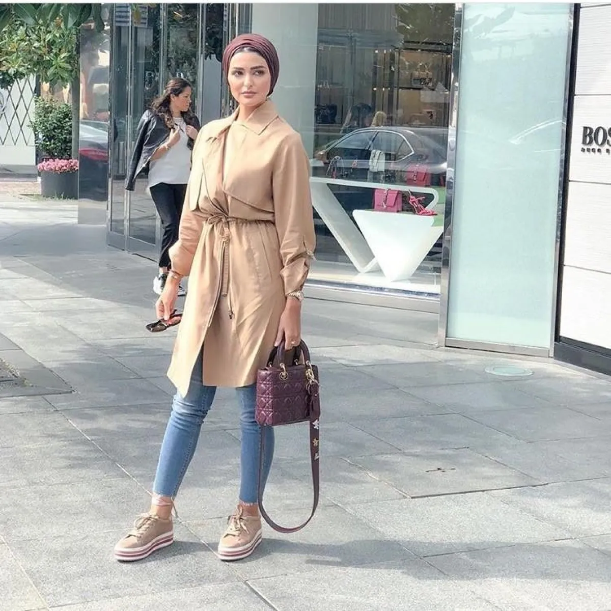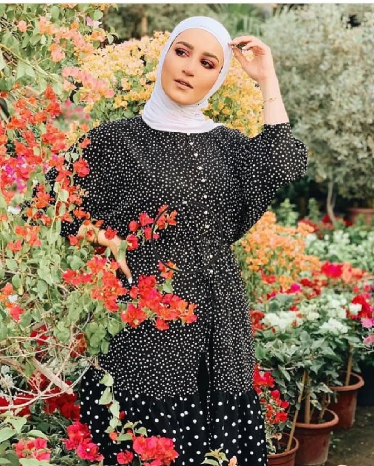 هذه الطريقة نفسها تعتمدها كثيرًا مدونة الموضة دلال الدوب، ولكنها بين الحين والآخر تختار ألوان حجاب مختلفة، مع حجاب مطرز بالخرز أو الدانتيل الناعم.