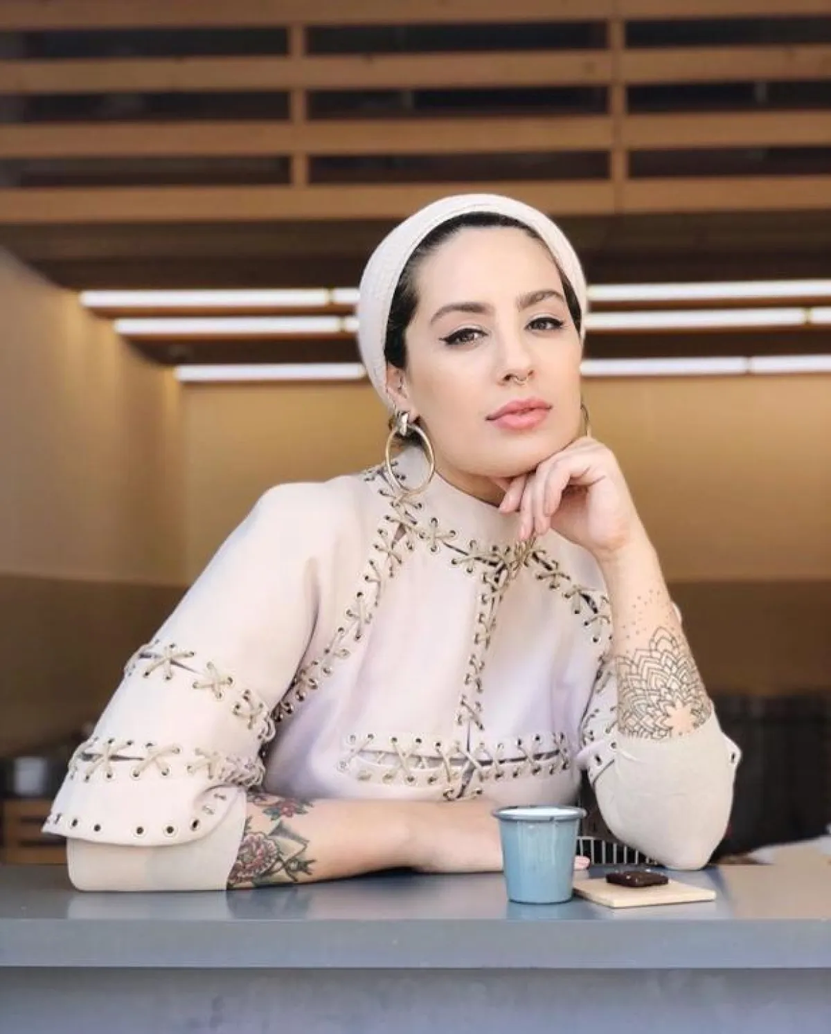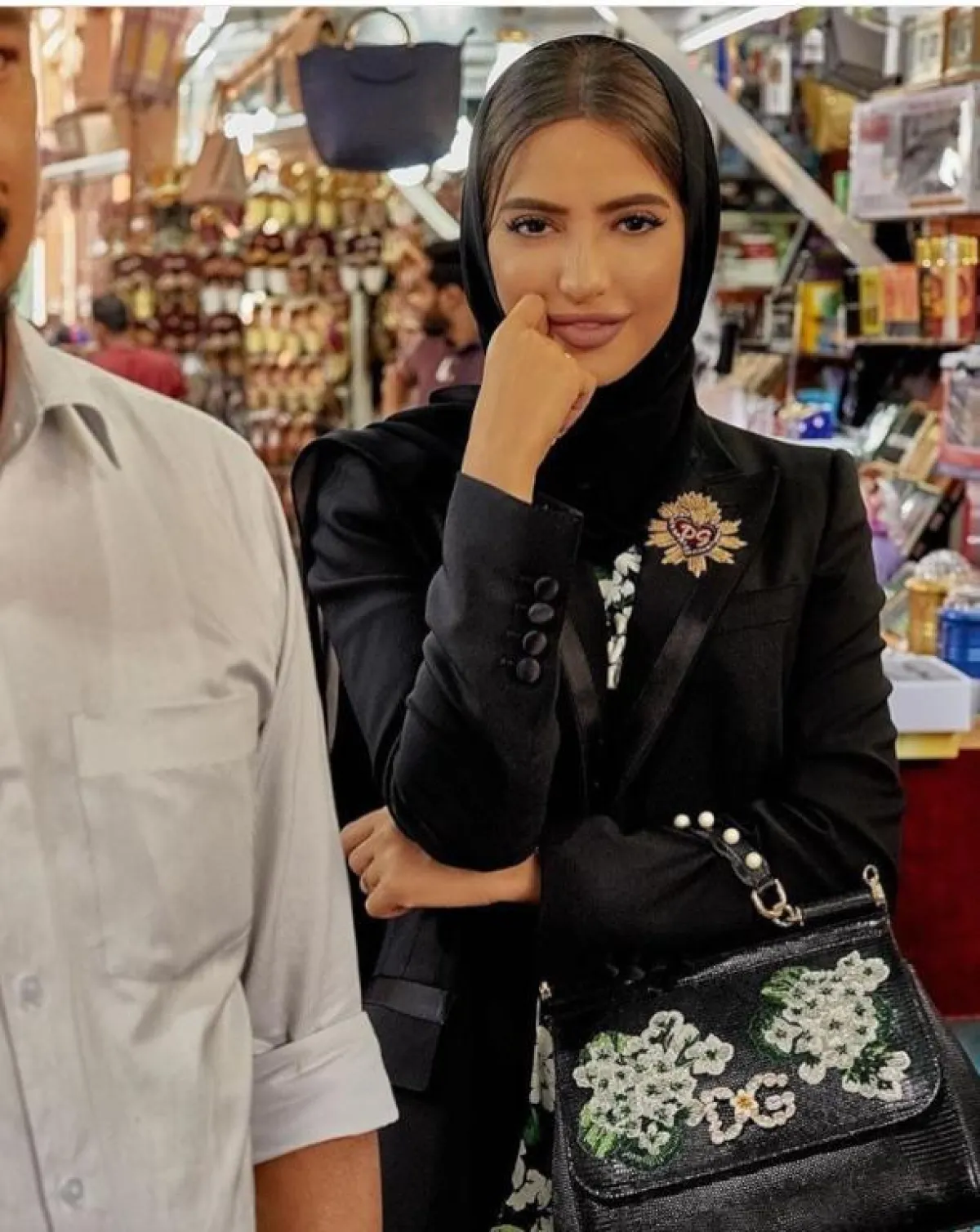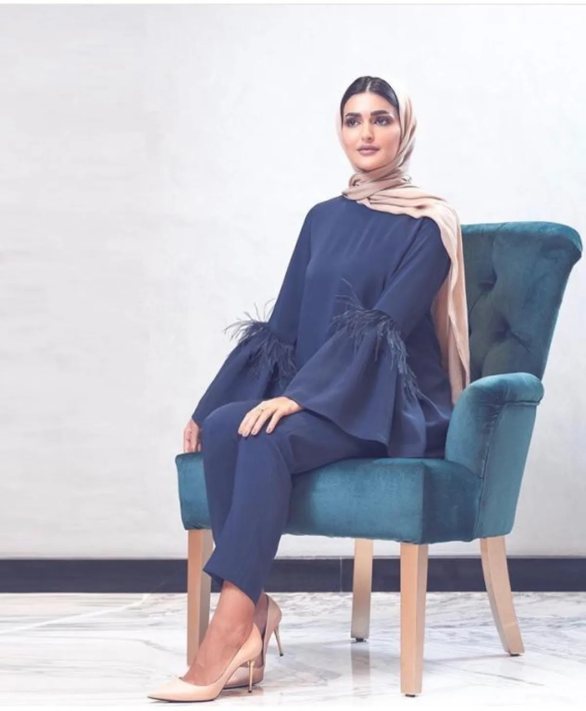 هذه الطريقة نفسها تعتمدها كثيرًا مدونة الموضة دلال الدوب، ولكنها بين الحين والآخر تختار ألوان حجاب مختلفة، مع حجاب مطرز بالخرز أو الدانتيل الناعم.