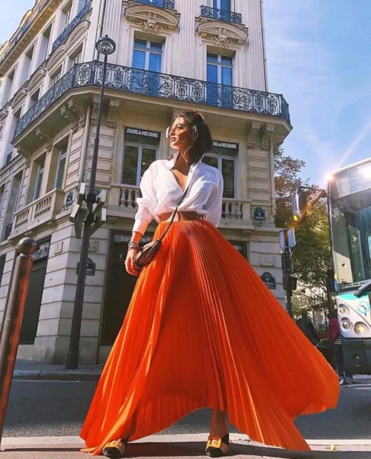ظهرت مؤخرًا مدونة الموضة اللبنانية كارن وازن بإطلالة نصف كلاسيكية، بالقميص الأبيض بالشكل العادي، ولكنها وظفته مع تنورة عالية الخصر بيليسيه باللون البرتقالي، مع حزام الخصر باللون البني، وشنطة من نفس اللون، لإطلالة ذكية حوّلت القميص الرسمي إلى إطلالة نصف كاجوال.
