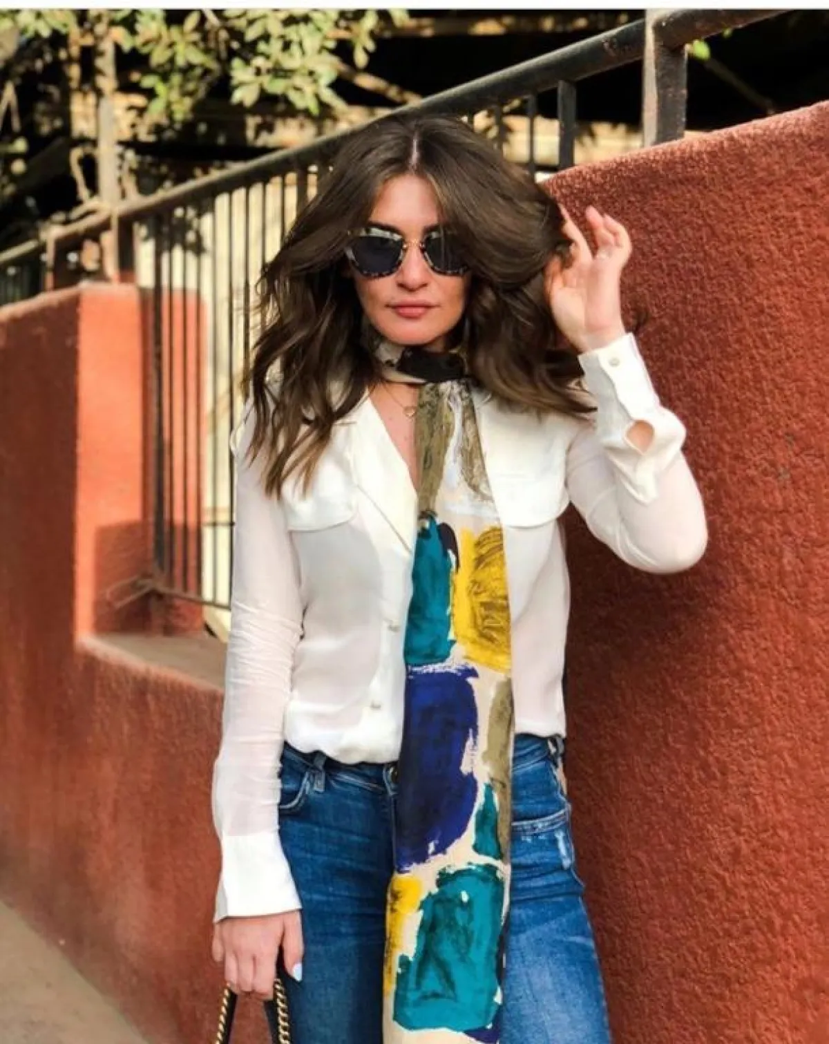بخامة الشيفون، ارتدته مدونة الموضة المصرية نهى الشربيني، مع الجينز واختارت السكارف على الرقبة، لإطلالة مستوحاة من التسعينات والثمانينات، تناسب الكثير من الفتيات النحيفات وصاحبات الوزن المتوسط، بشرط أن يكون الجينز بتصميم الشارلستون.